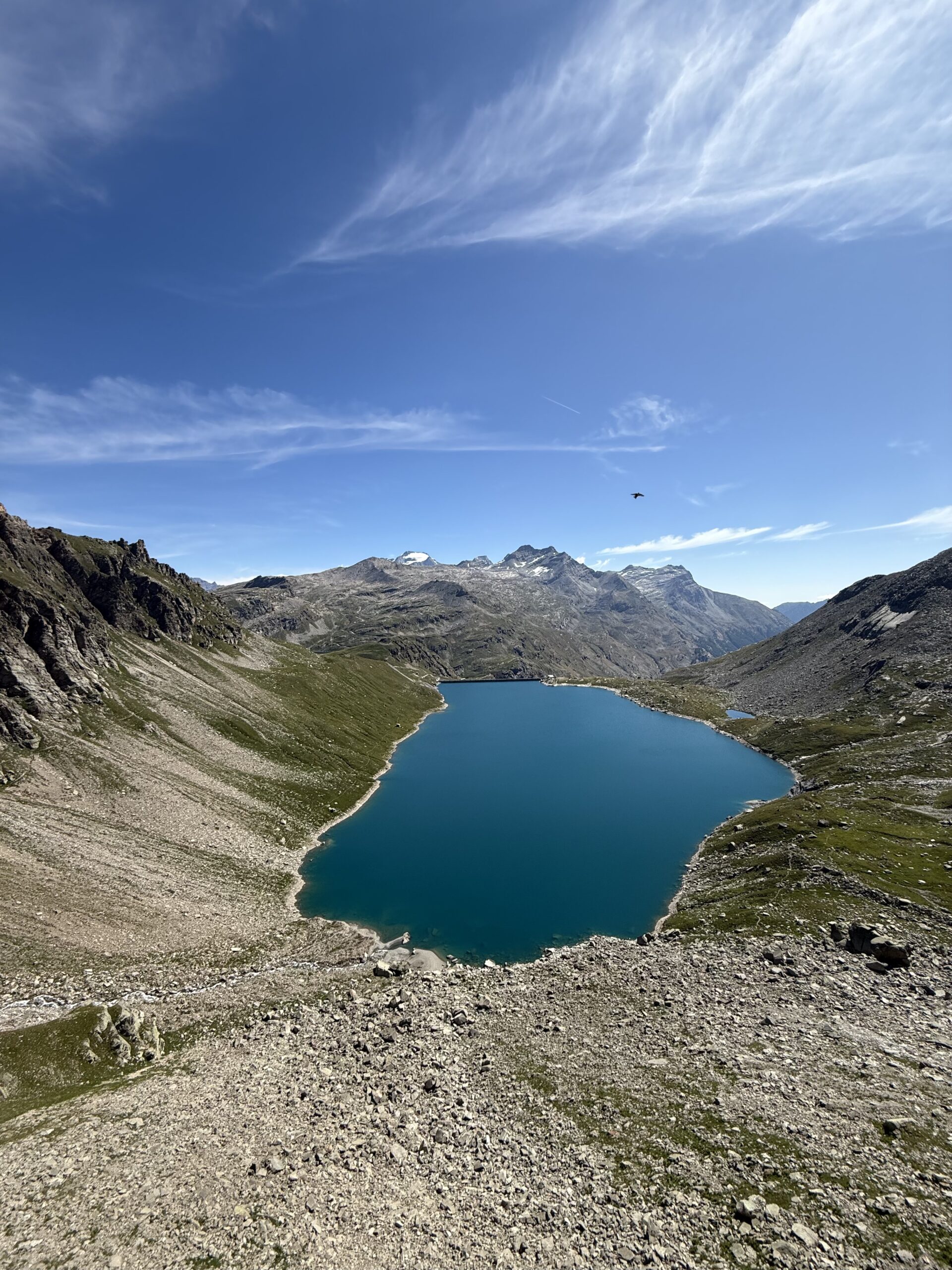 Evidente muro in fondo del lago, avvicinamento molto comodo e corto, ambiente spettacolare, via logica con movimenti interessanti e vari. Materiale: 2 mezze da 60metri, friend…