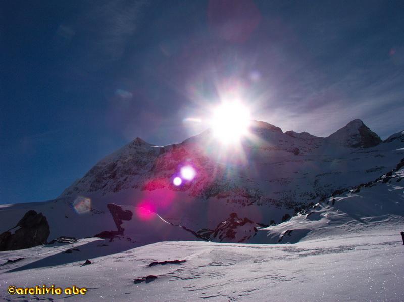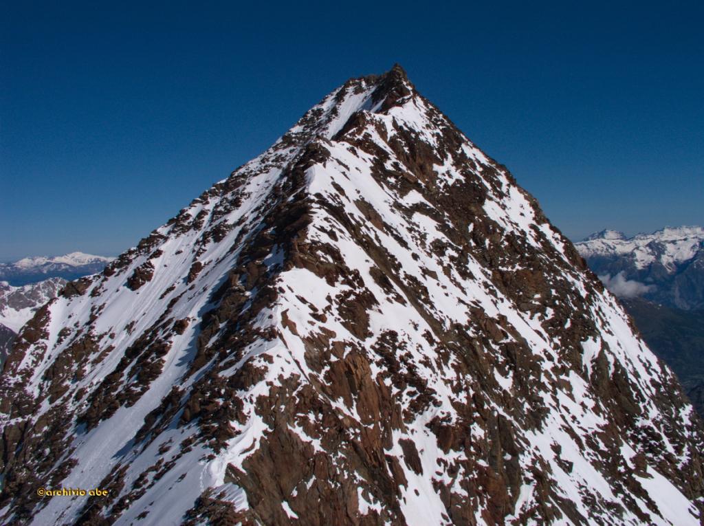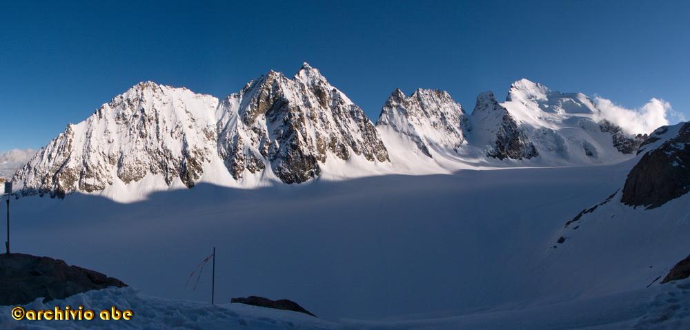 | abe | Prime luci all'inizio del canale del Dirrujoch | abe | Dal Dirruhorn uno sguardo alla cresta da percorrere | abe | Il tratto di cresta tra il Dirrujoch e l'Hobarghorn | abe | Cresta di salita al Dirruhorn salendo all'Hobarghorn | abe | Il tratto di cresta dall'Hobargjoch e lo Stecknadelhorn | abe | Ultimo tratto di salita allo Stecknadelhorn
