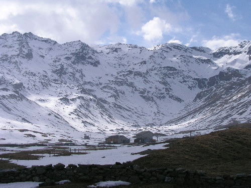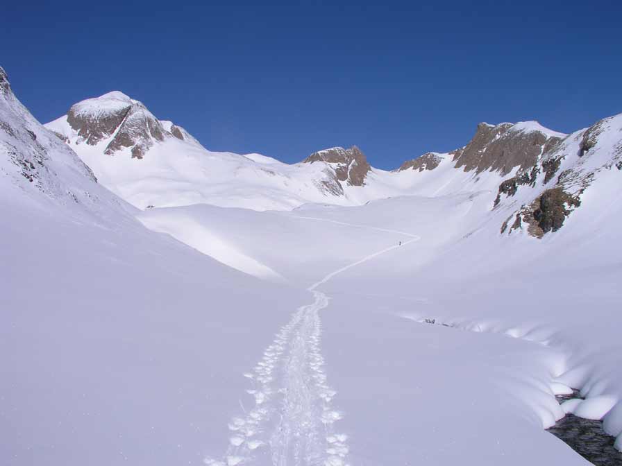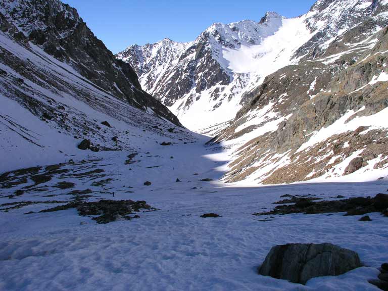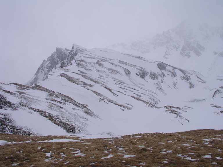 | abe | Quota 2710 alle Coste di Serena con il tracciato di salita. | abe | La "desolante" vista della Punta d'Orogna dal Monte Cazzola | abe | La parte finale del vallone vista dal colle.