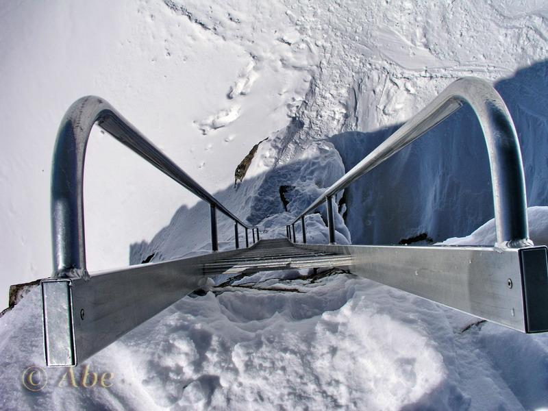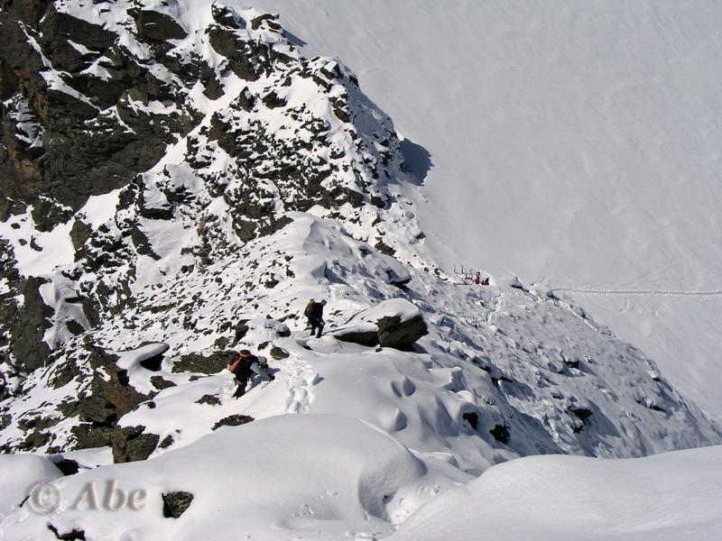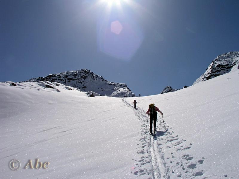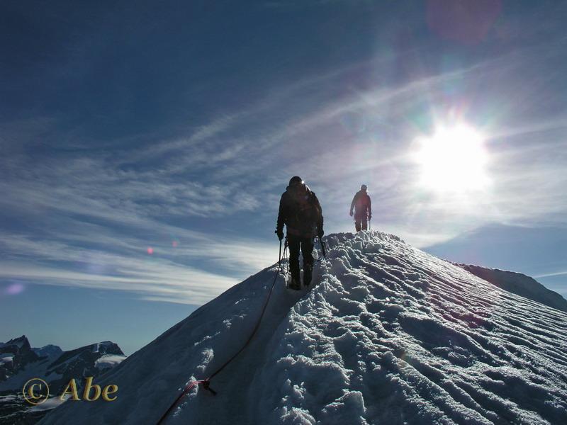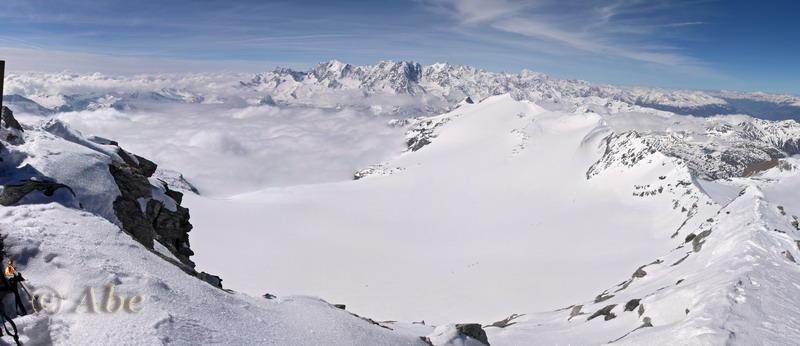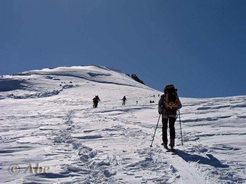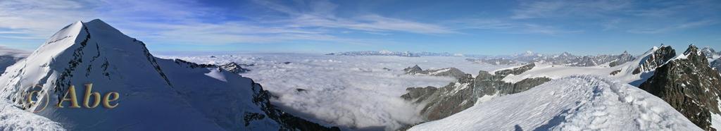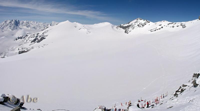 | abe | Alpjergletscher e Breithorn dal deposito sci | abe | Panoramica dalla cima | abe | Nei pressi del Breithornpass | abe | Cresta finale | abe | Cresta finale dal deposito sci