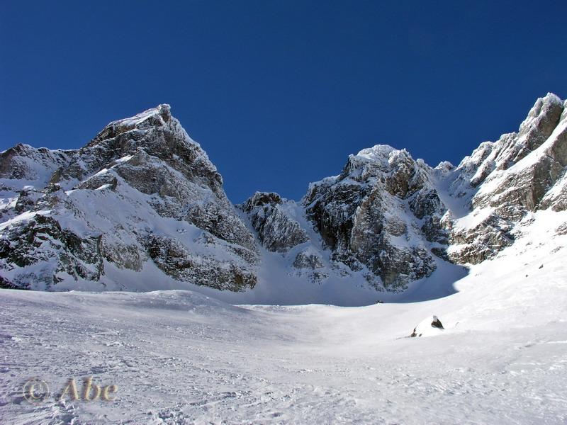 | abe | Vallone di salita, in fondo la cima. | abe | La cima con in canale di salita. | abe | Si continua a salire. | abe | Cresta finale. | abe | L'Adula osservata da un elefante? | abe | Si scende.