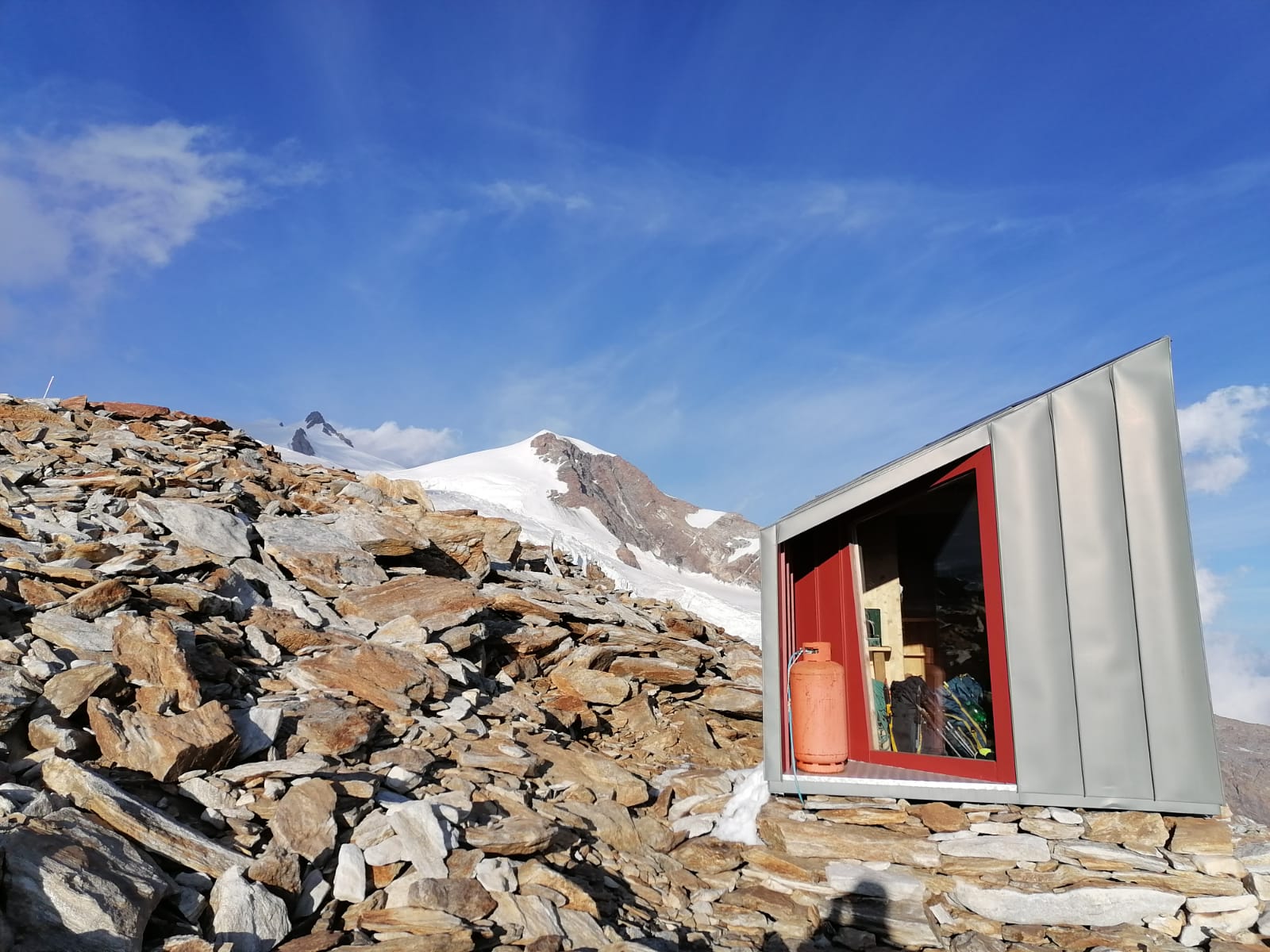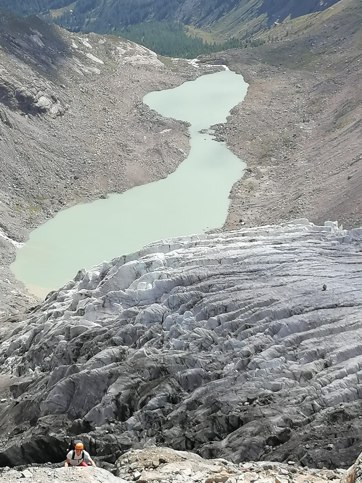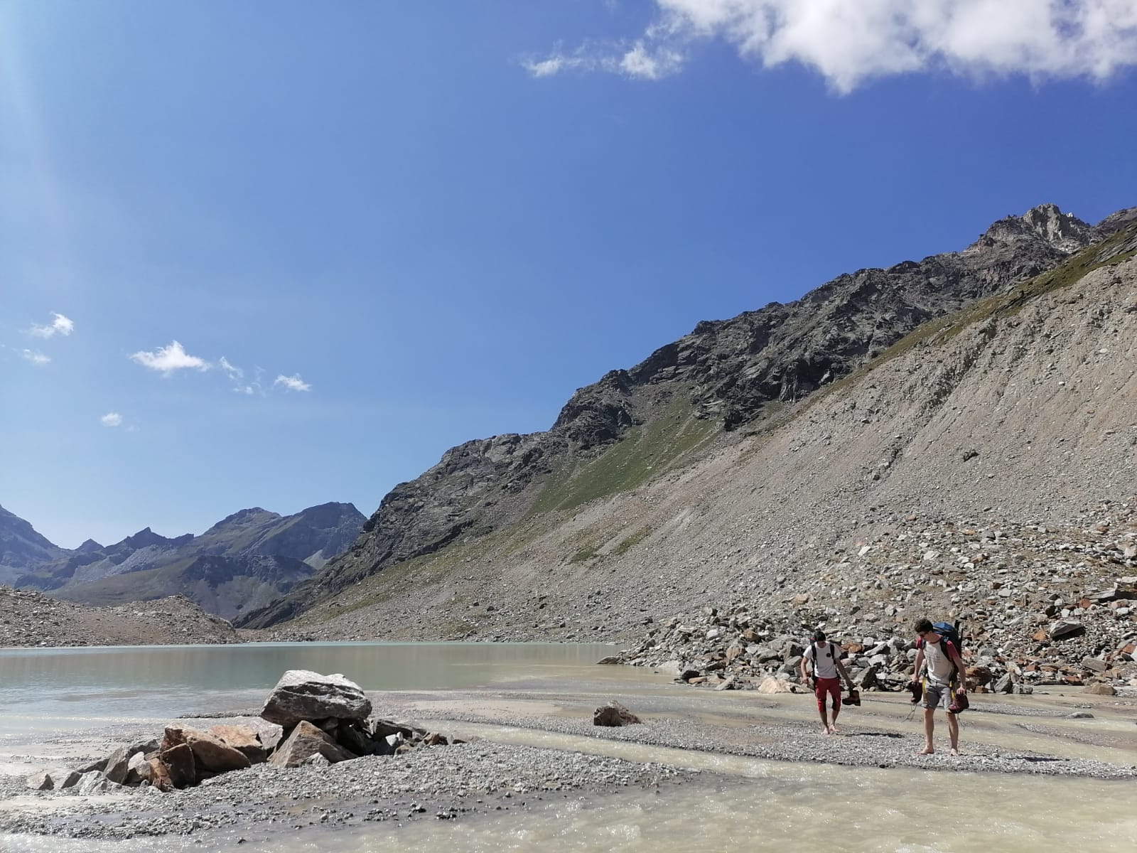 | albev | guado in riva al lago | albev | vista dal famoso praticello, con i due rami dal ghiacciaio del lys | albev | facili placche poco sopra il praticello, | albev | Il bivacco Mamo