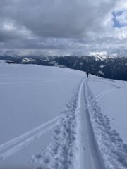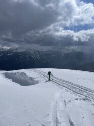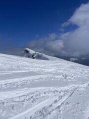 Si parte con gli sci in spalla per pochi metri. Neve nella parte inferiore già molto pesante e trasformata dal caldo. Parte centrale con crosta…