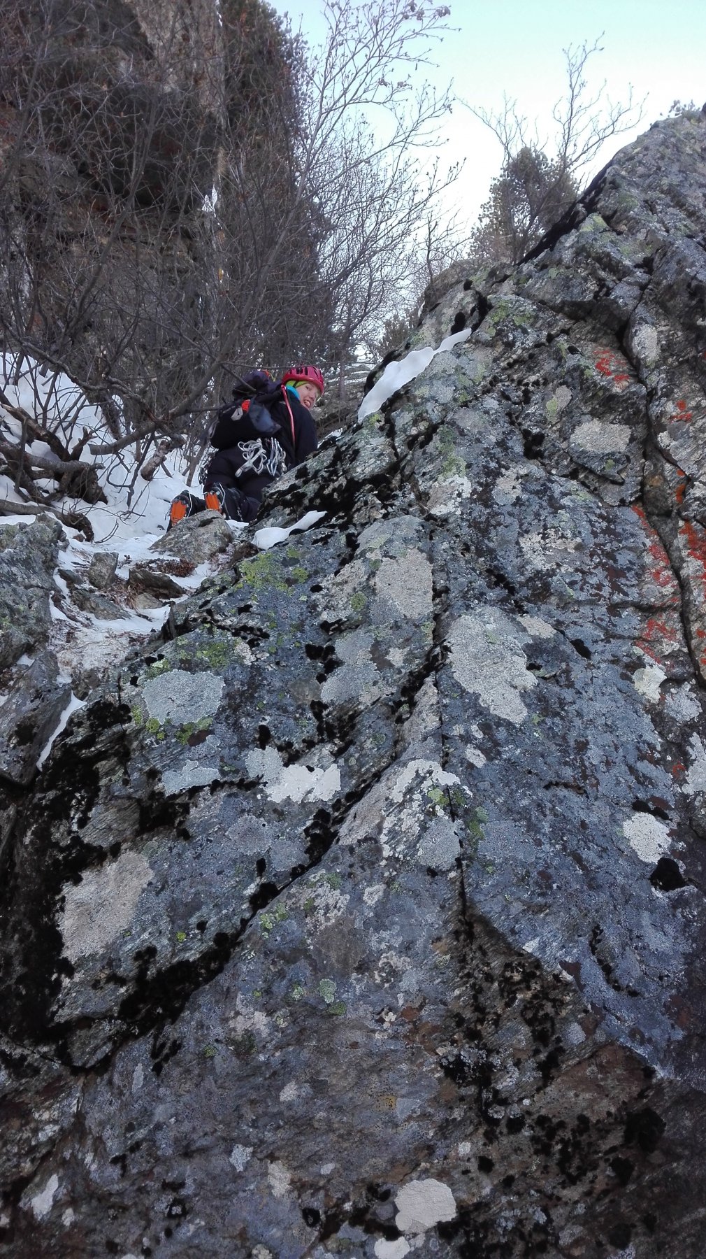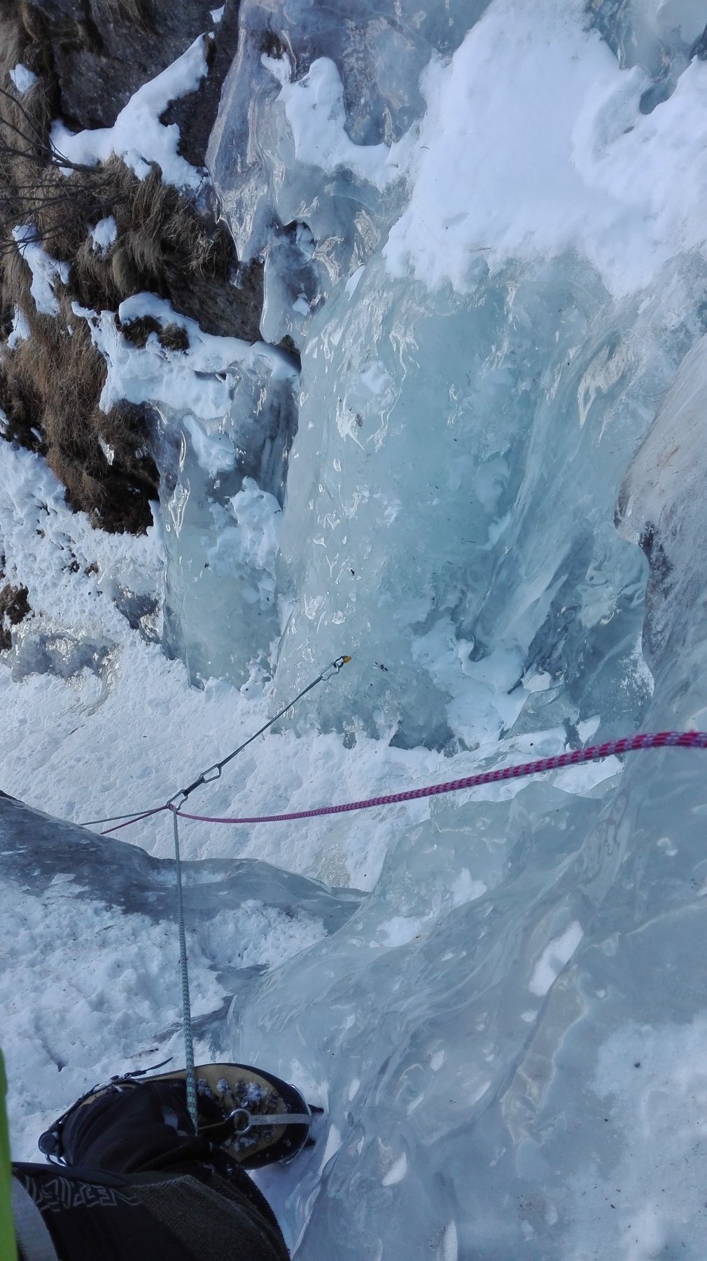 Avvicinamento su traccia ottima e diretta, ghiaccio morbido e lavorato, passaggio del sesto tiro completamente secco, discesa su sentiero perfettamente battuto.