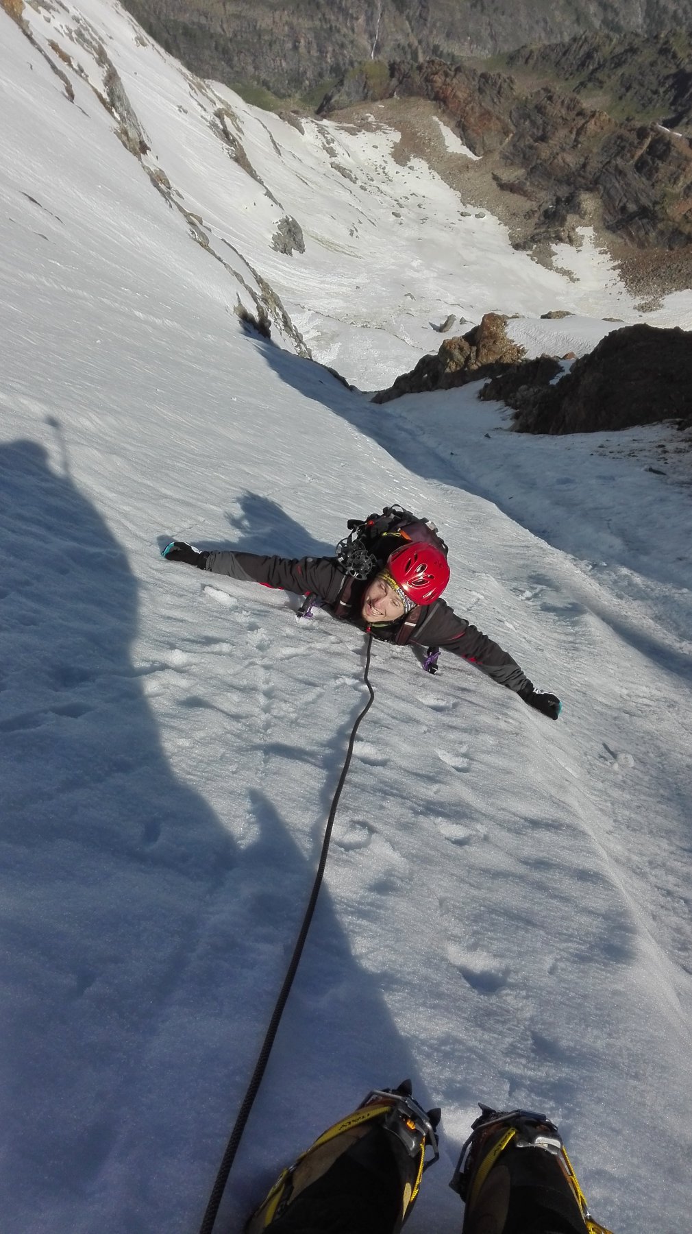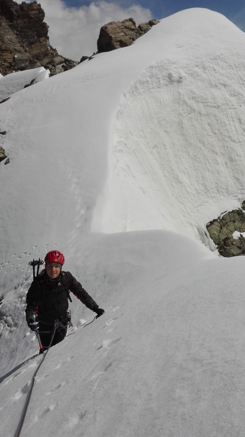 Quota neve 2500 m. Neve bella compatta nella salita. Parete in condizioni perfette. La cresta invece è ancora molto carica. E nella discesa si sprofonda…