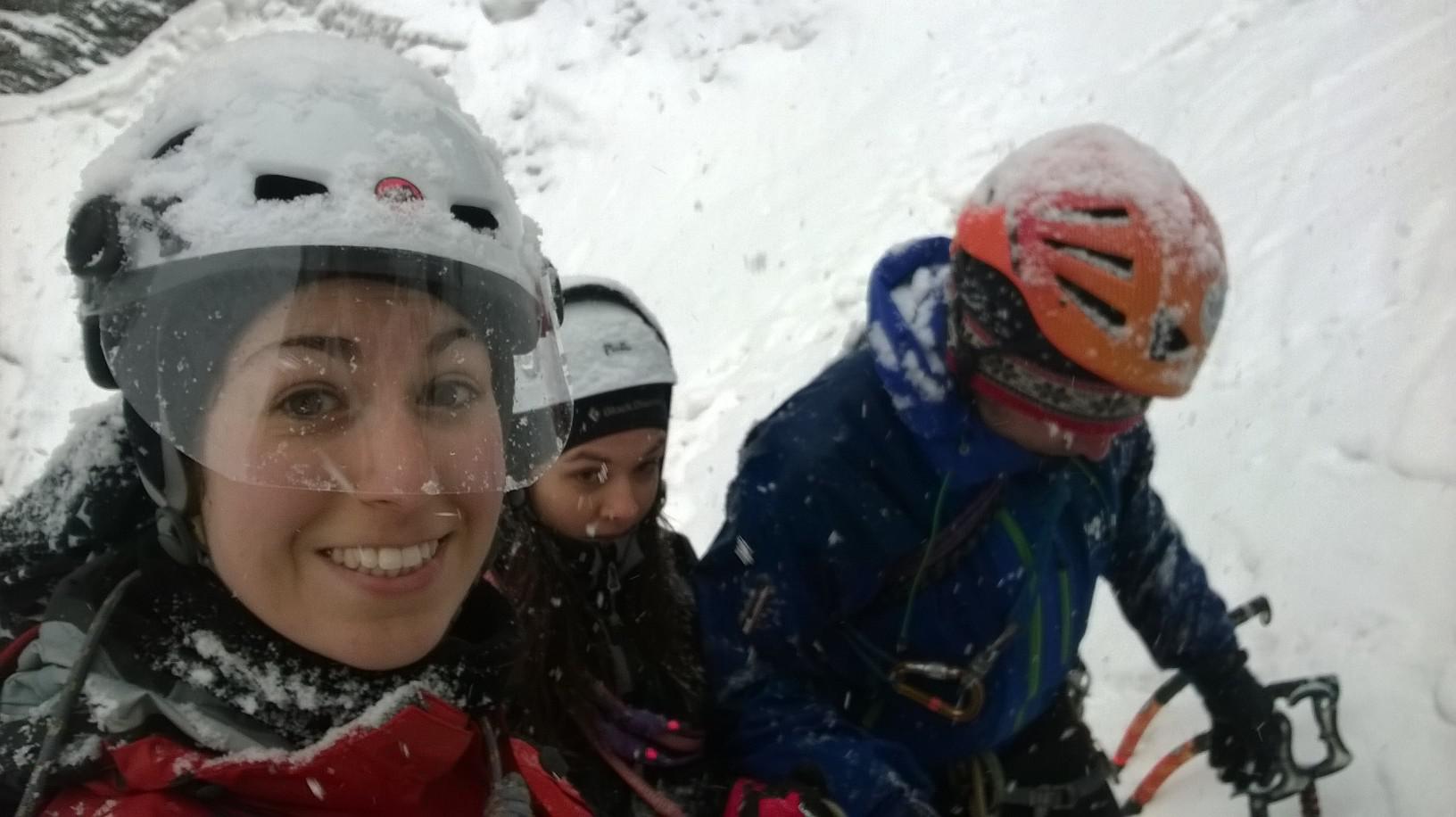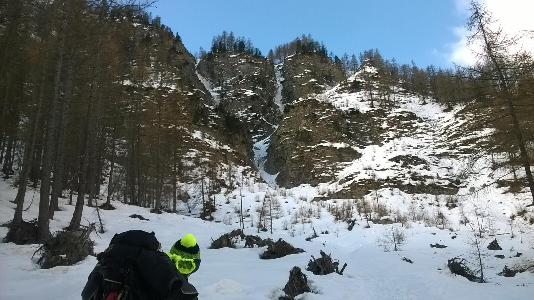Fatto primo tiro in comune con Valeria, sosta su piccolo larice sullo spartiacque delle due cascate. Gli ultimi due tiri si fanno proteggendosi abbastanza bene ma…