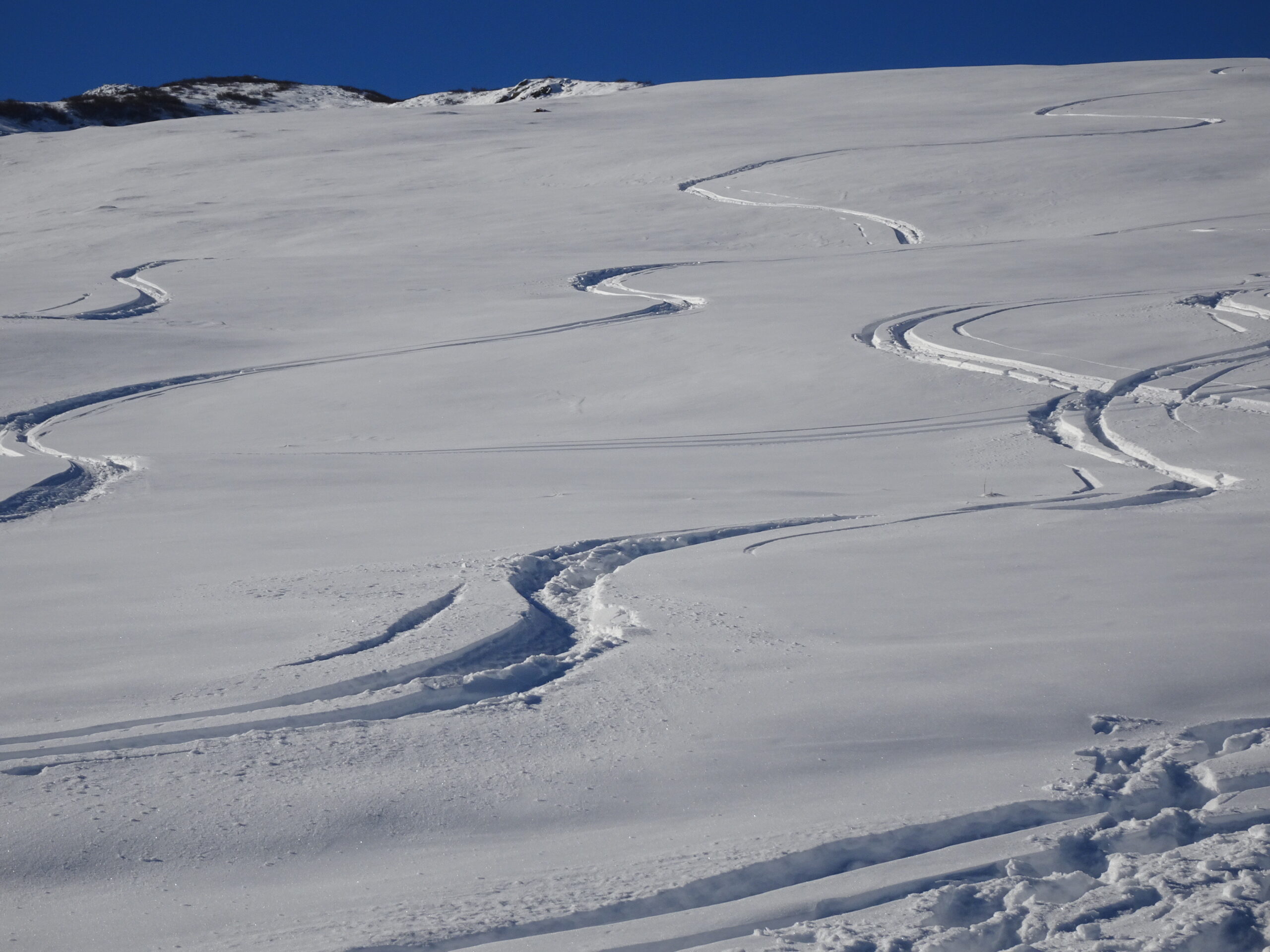 neve farinosa ma non molta. bella giornata, saliti tramite stradina laterale alle piste fino al termine degli impianti, oltre a noi non sembrava il caso…