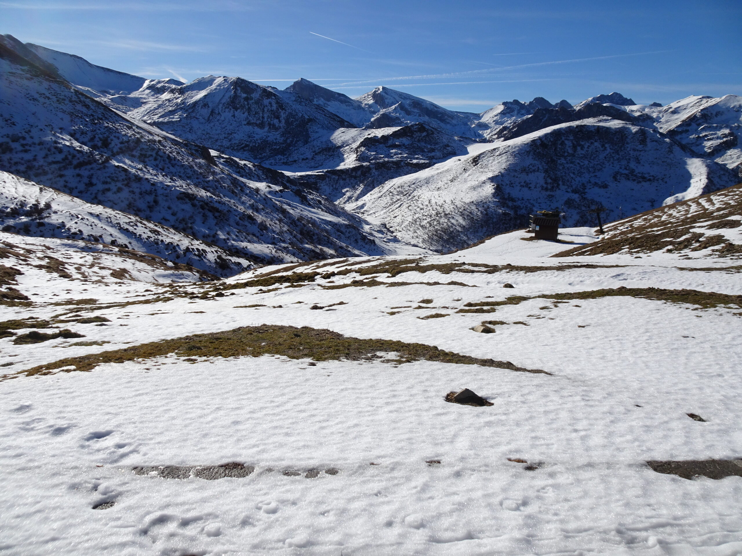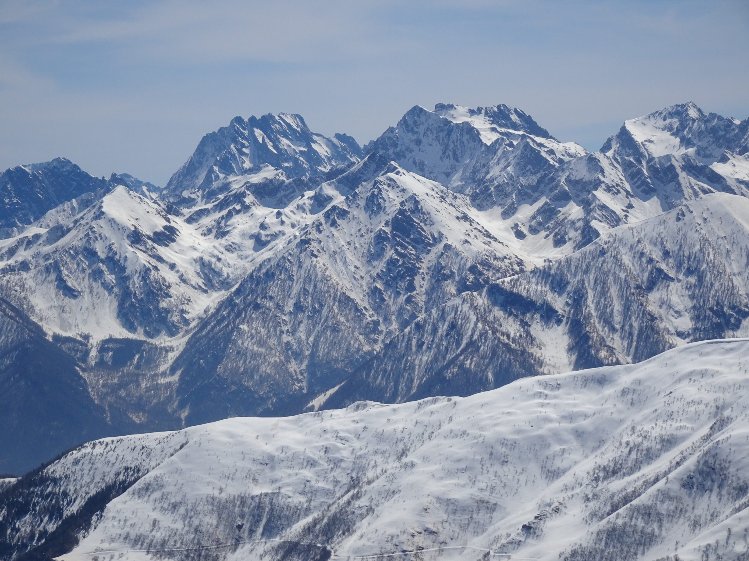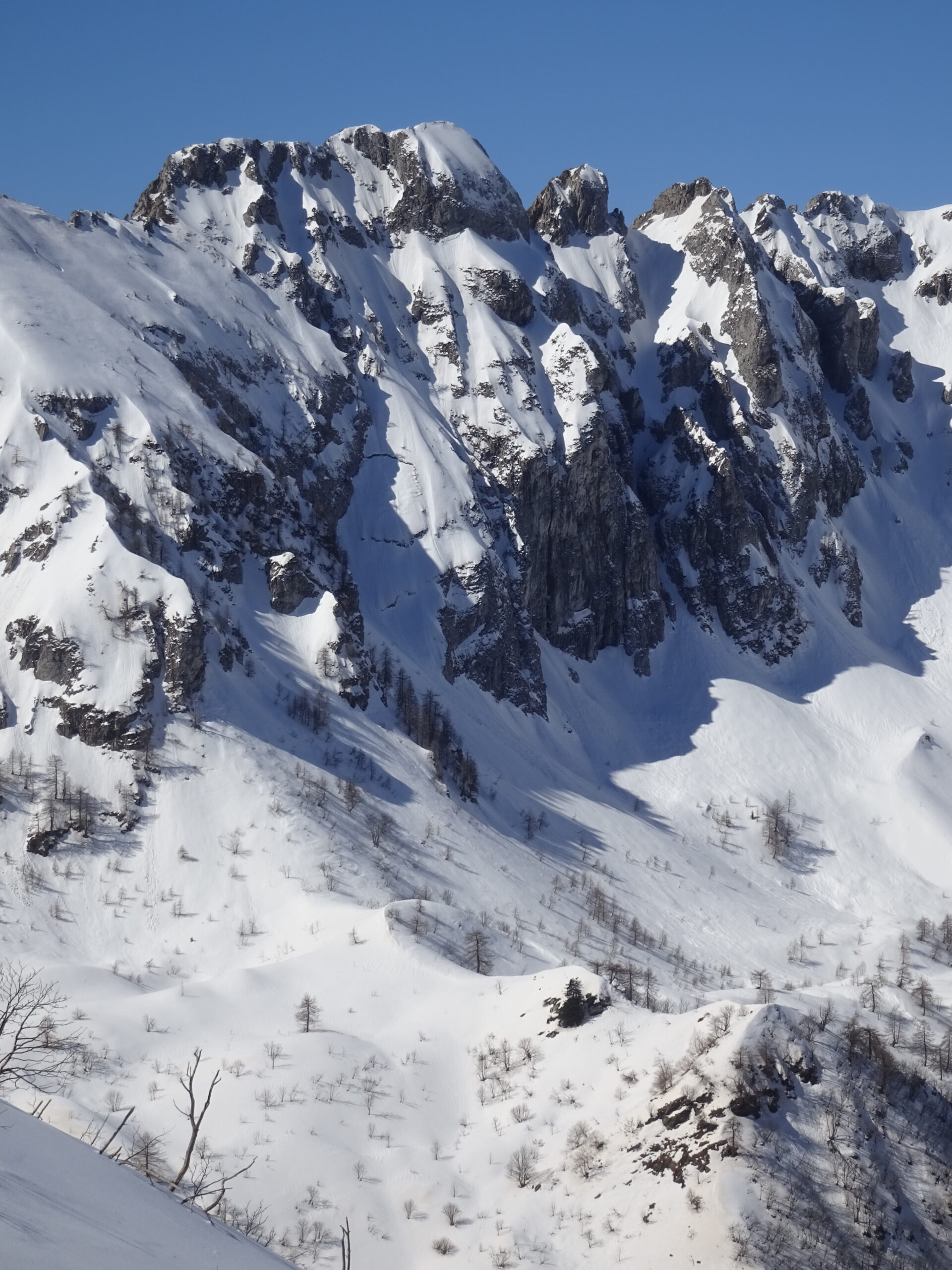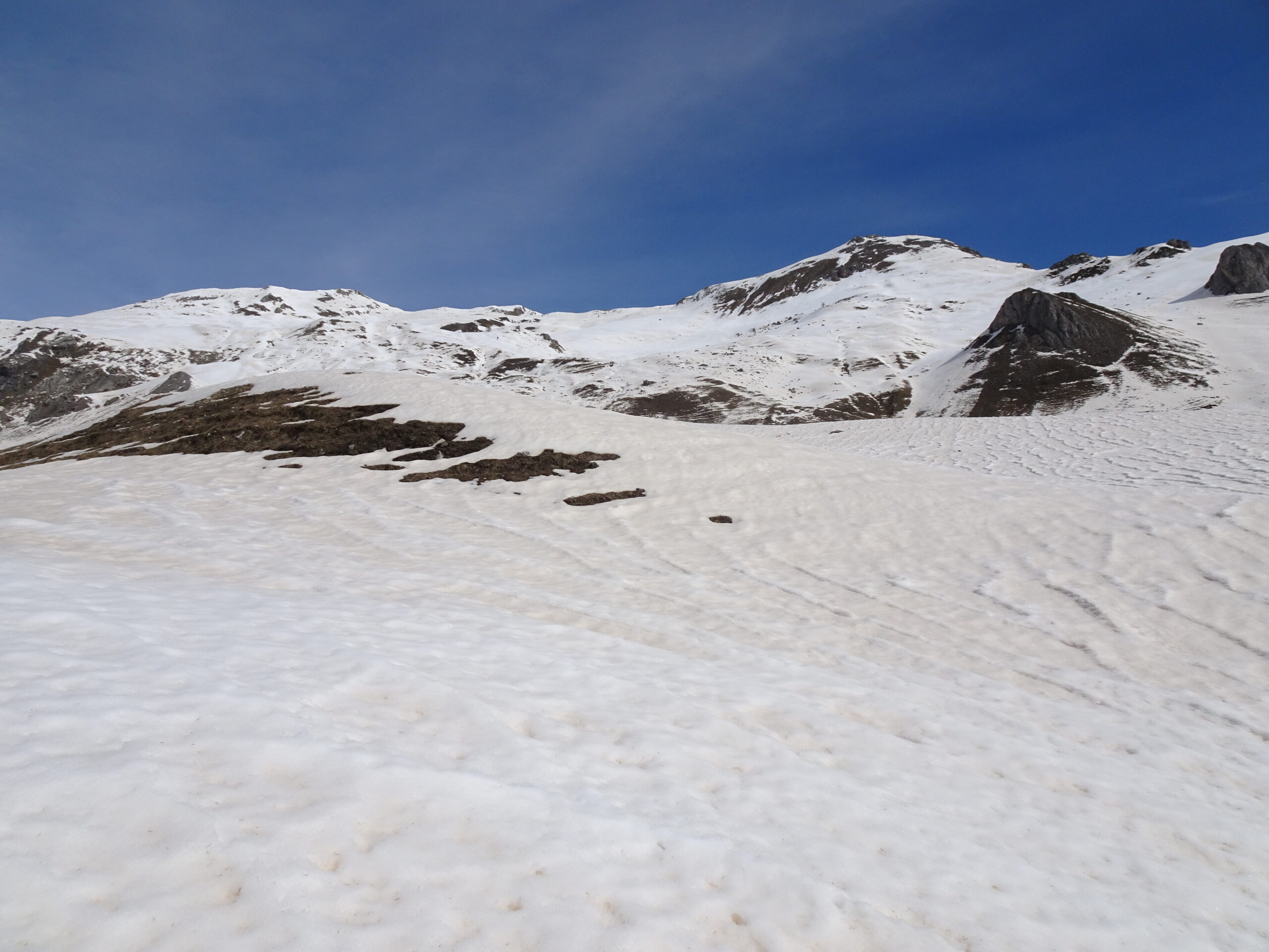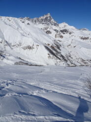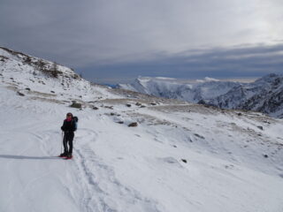 ancora discreto innevamento che permette una rapida salita fin oltre il lago di nasta. da sotto il colle della forchetta e lato Chiotas neve assente.…