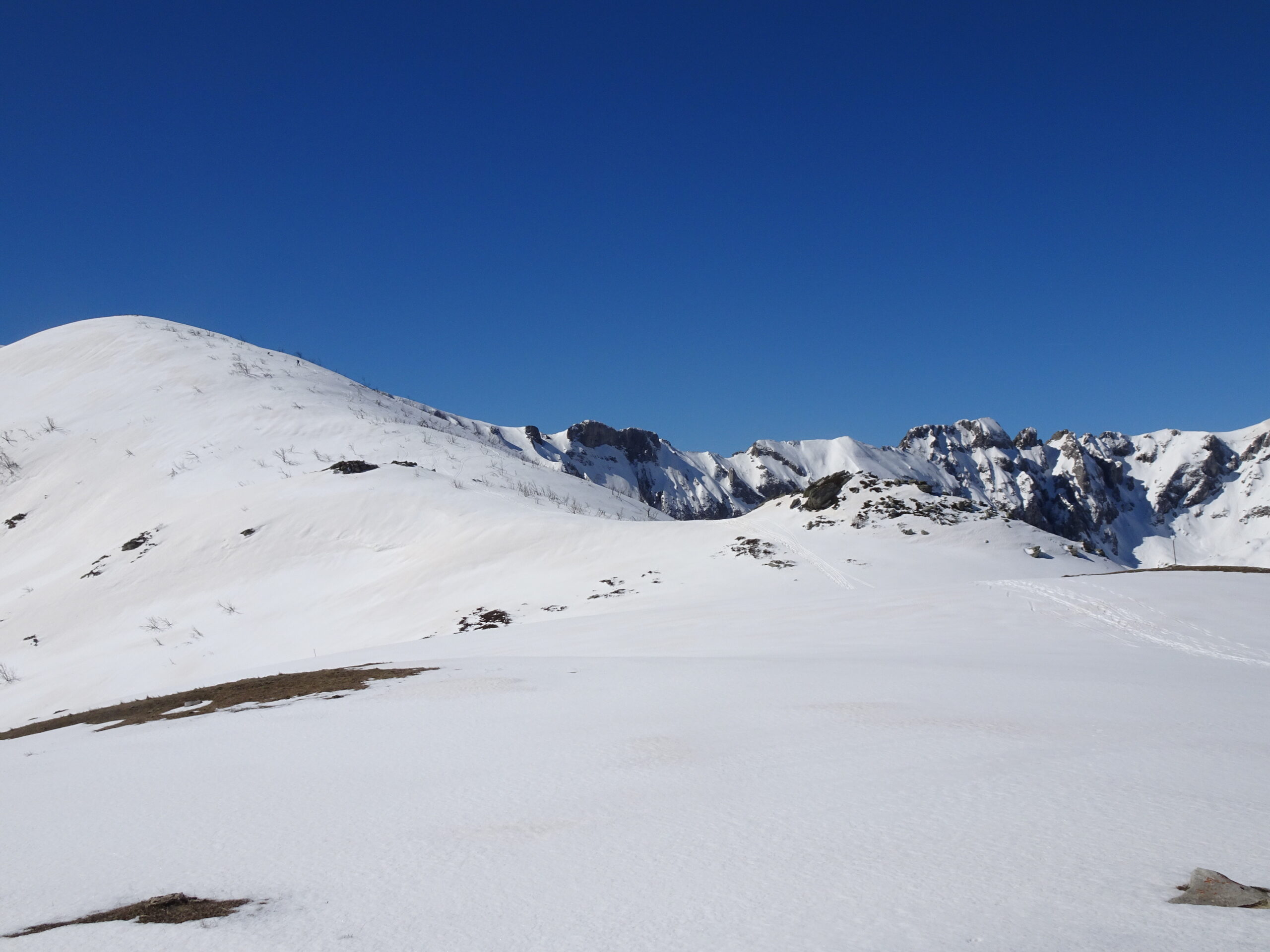 neve dura nel canalone diretto a Colla Bauzano successivamente primaverile ma comunque scarsissima su tutto il percorso