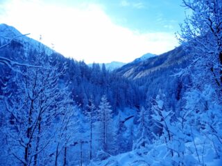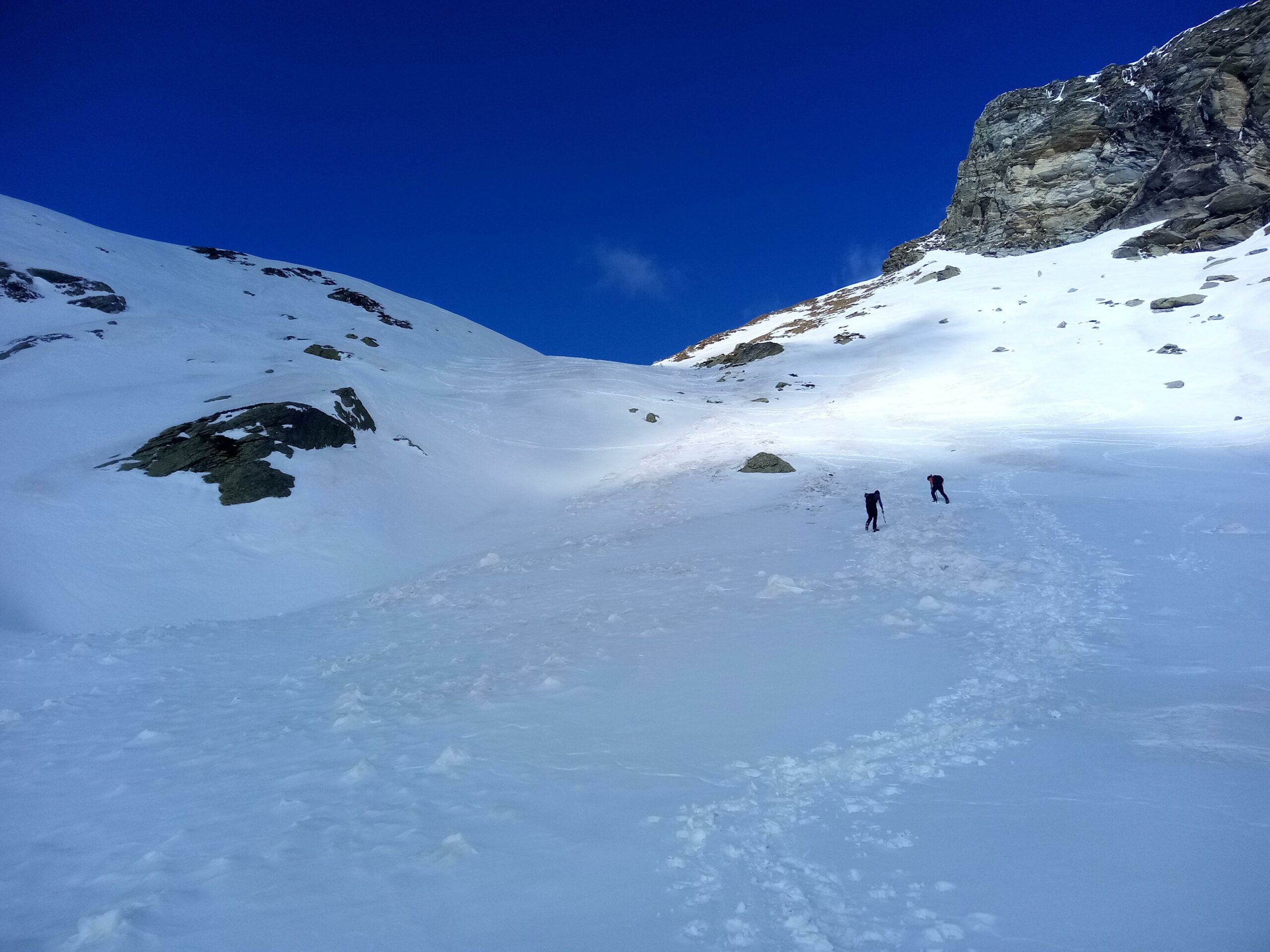 Freddo e ghiaccio in basso, in alto i versanti al Sole sono senza neve (portata via dal vento). Dopo la Mautino era tracciata solo da sci…