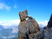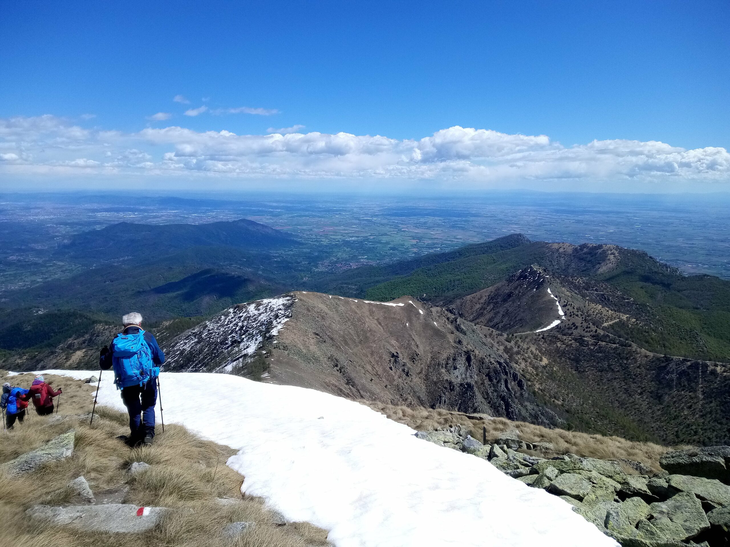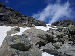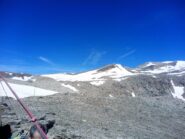 Qualche nevaietto duro non da fastidio: ramponcini rimasti nello zaino. Caldo praticamente estivo, ma vento freddo in cima... Mangiato al riparo delle rocce, ben sotto.