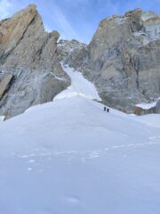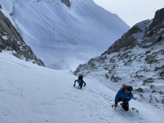 Bel canale ancora in condizioni, abbiamo trovato neve molto compatta, terminale piena di neve, si passa al centro senza problemi. discesa per la cresta.