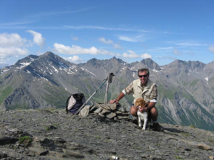 | bengia | cartello indicatore lungo il percorso | bengia | la nostra meta | bengia | la parte finale: gli ultimi 500 mt.di dislivello | bengia | in lontananza si intravede la croce | bengia | il Lago Fauri | bengia | la testata finale della Val Argentera | bengia | Bengia in vetta con Flick | bengia | l'anticima
