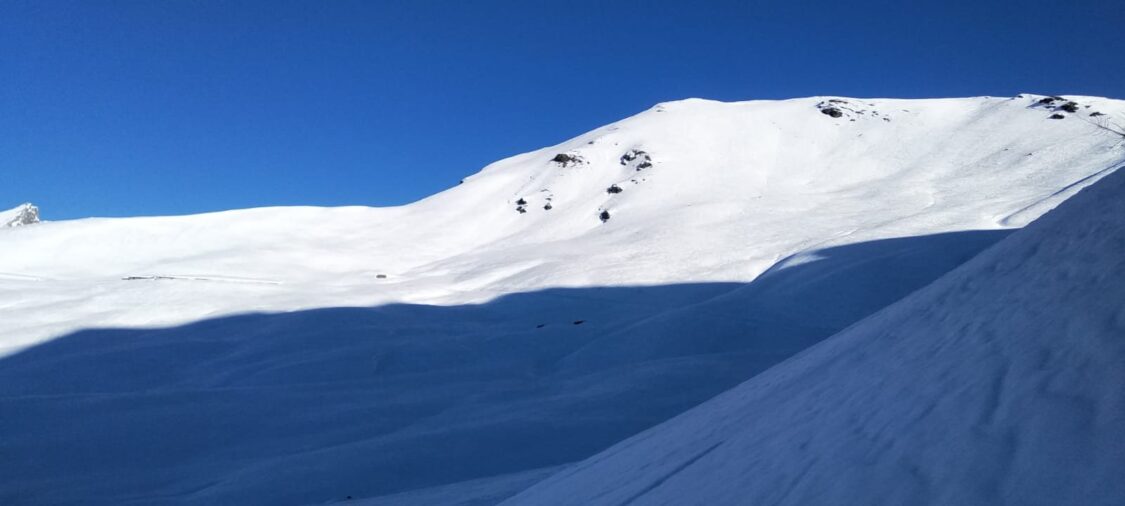 Salita su sentiero e poi poderale su fondo durissimo , tracce di salita al colle ghiacciate. Discesa su neve con crosta da vento portante alternata…