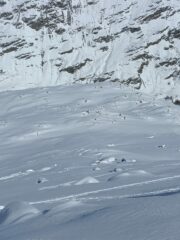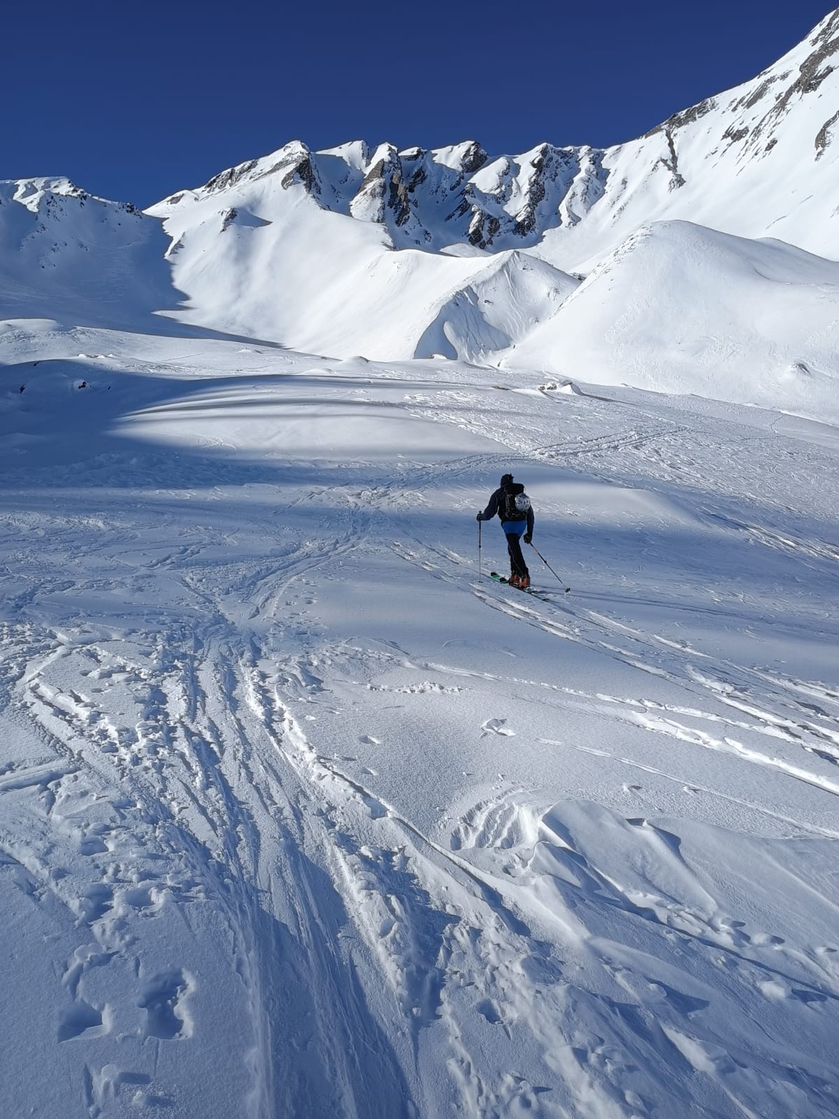 Fermati alla Tza de Flassin per bianco, vento e neve. Le centinaia di tracce precedenti sono ammorbidite da 10-30 cm di farina leggera, fredda e…