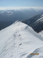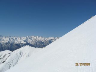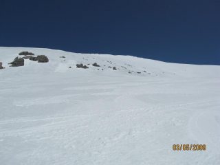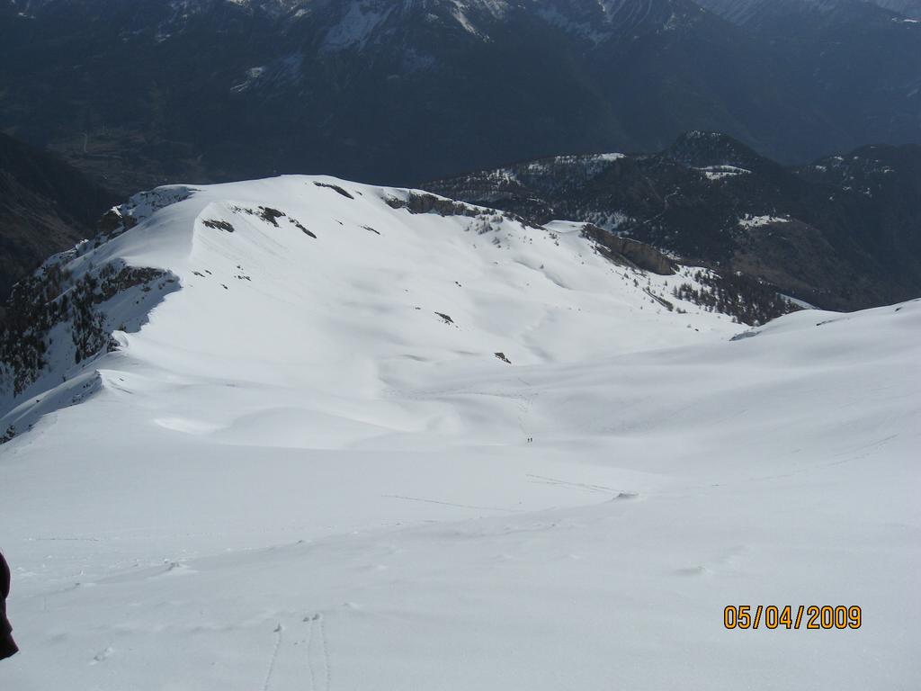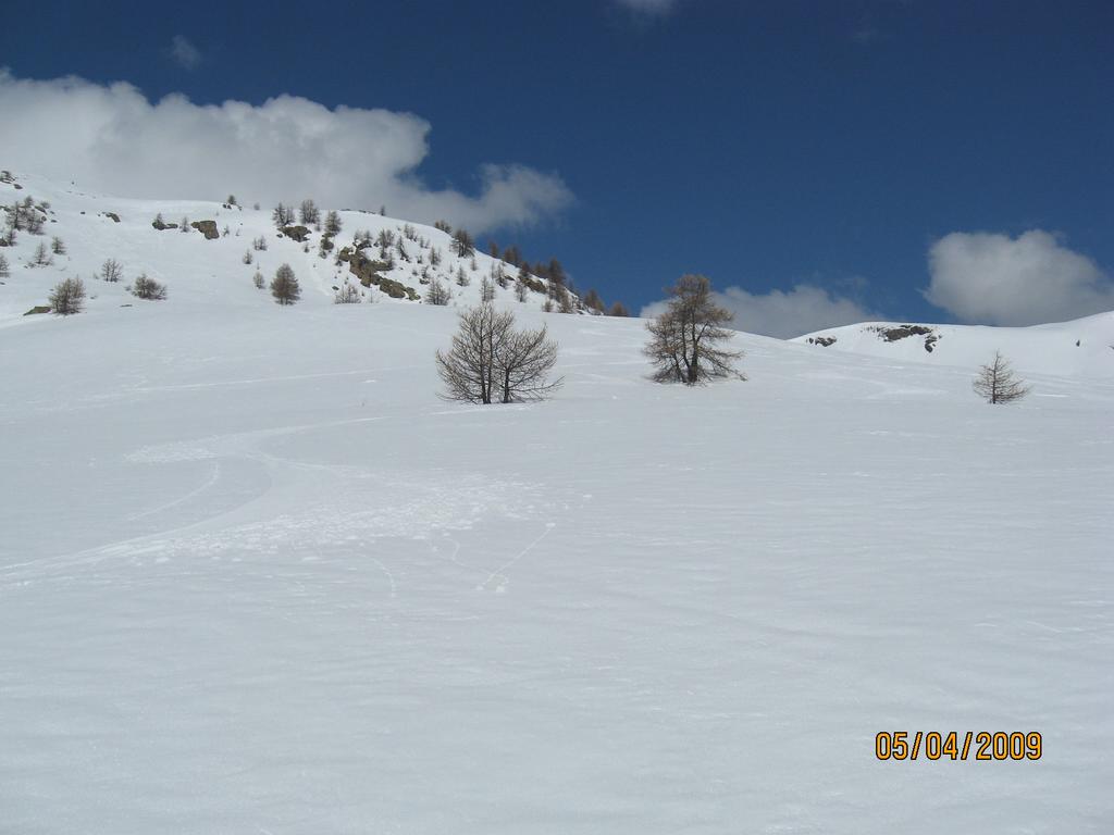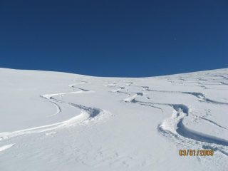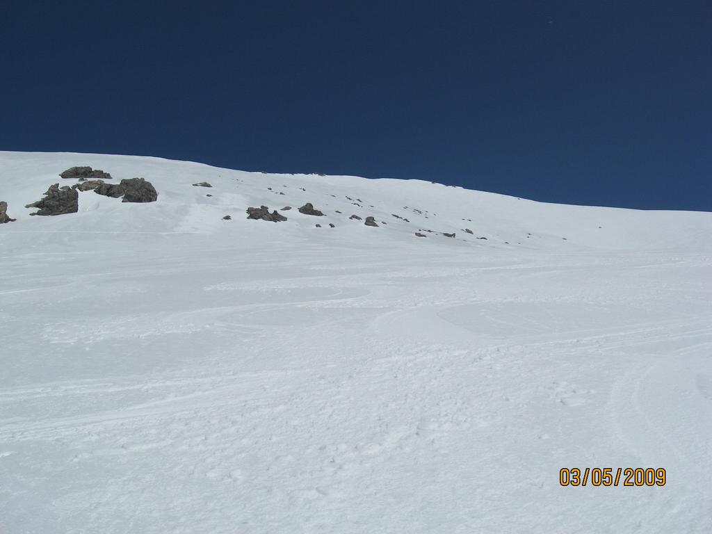 Saliti per la via classica dove ho notato pochi tratti di farina e tanta crosta non portante; scesi dal vallone a sx con ottima farina…