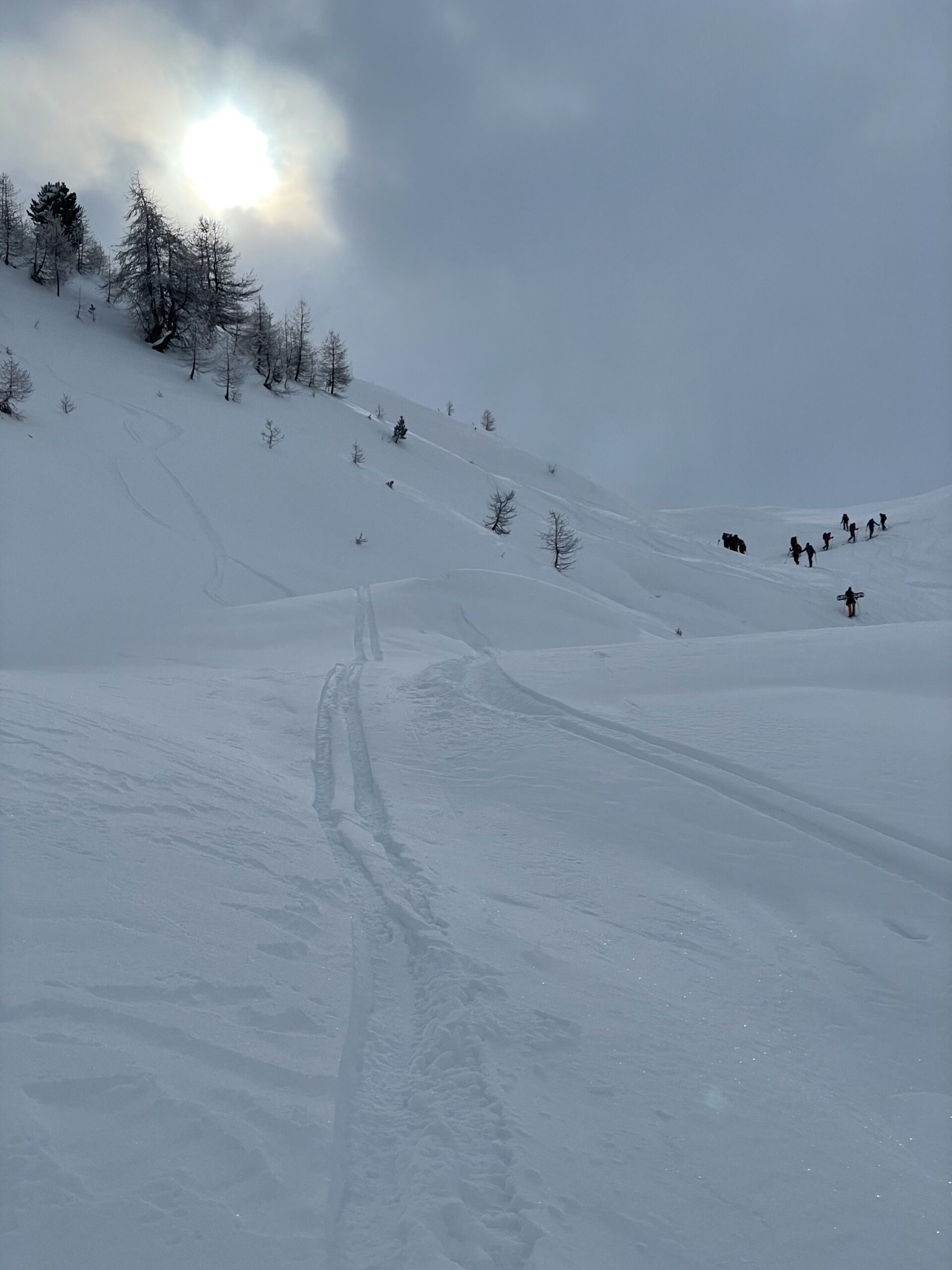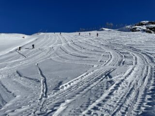 Poco da dire: bella neve e tanta gente. Forse sarebbe stato meglio girare verso il Begino o il Courbiun ma senza la certezza della bella…