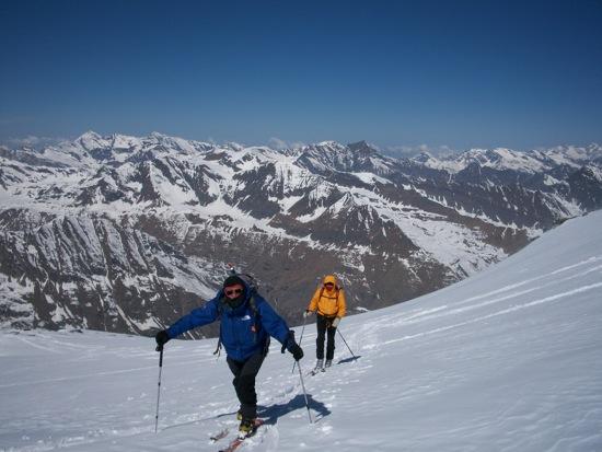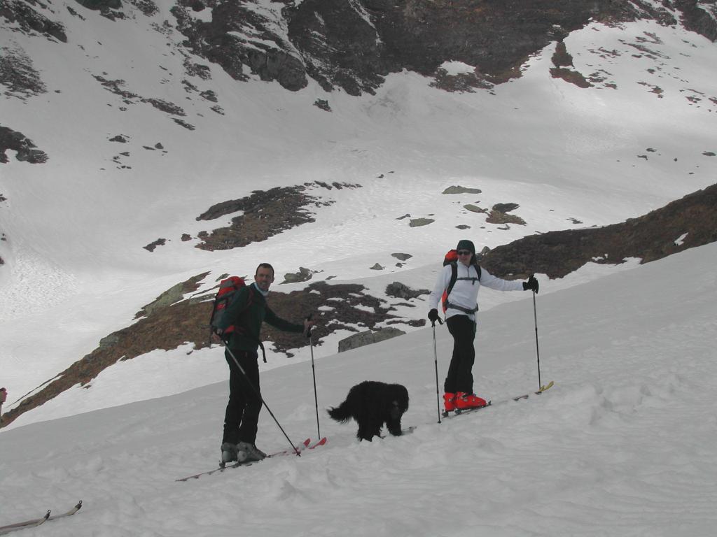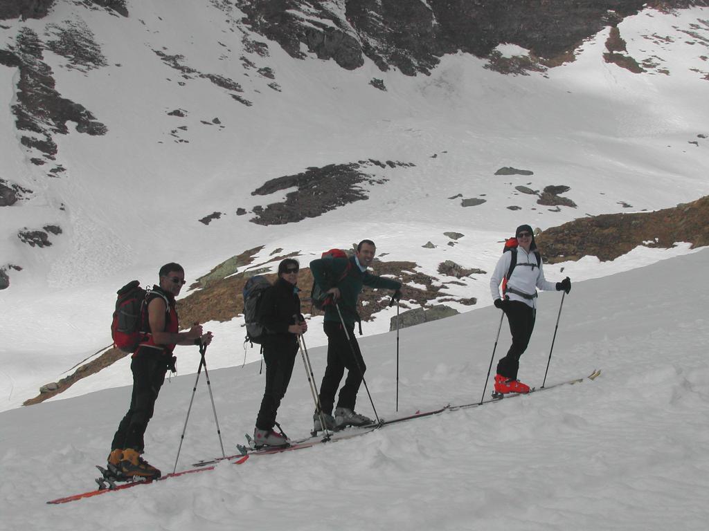 partiti alle 6,45 dal Benevolo risaliti per poco più di mezzora con gli sci in spalla sulla parte dx orografica. Sci ai piedi dopo quota…