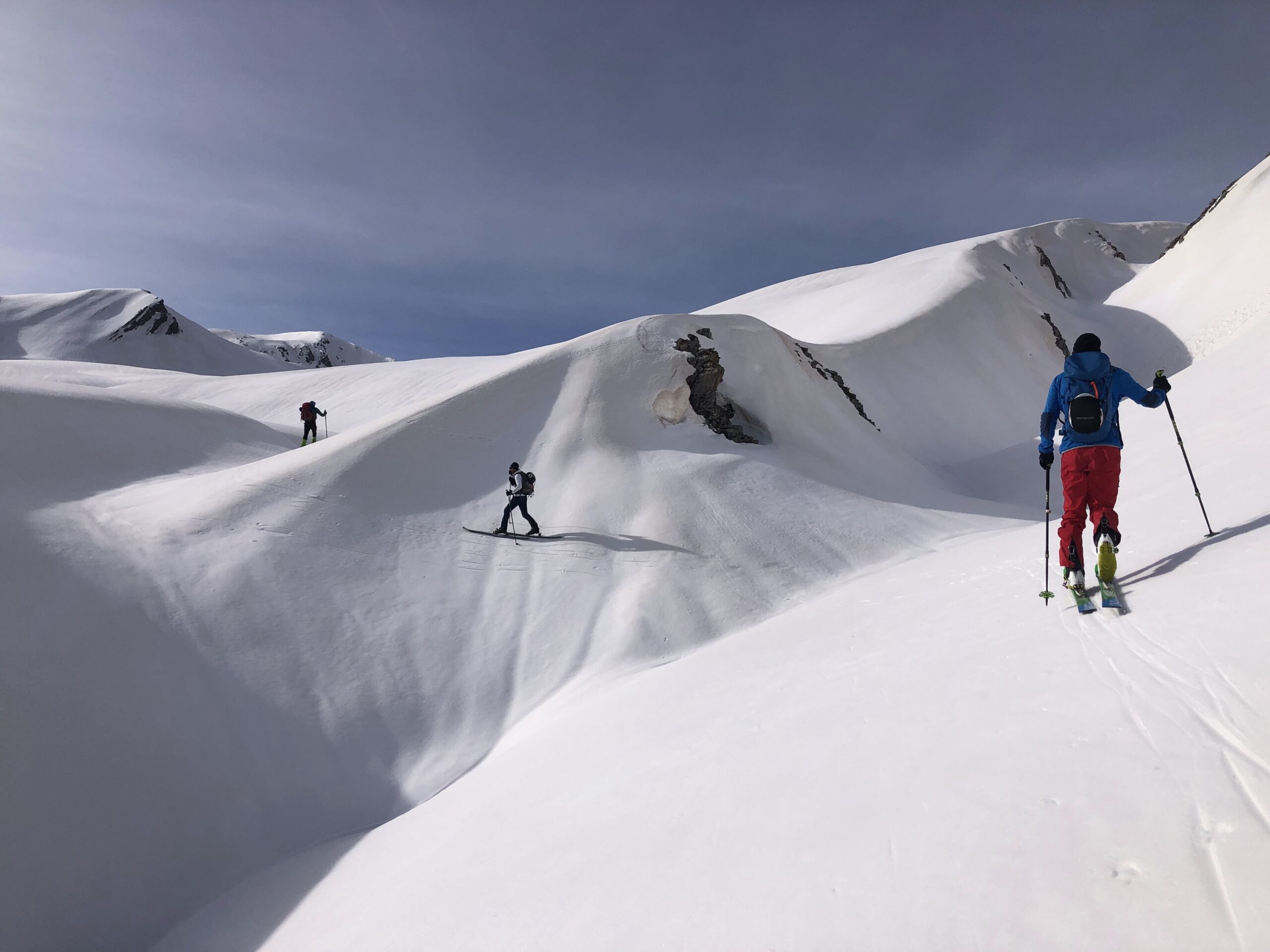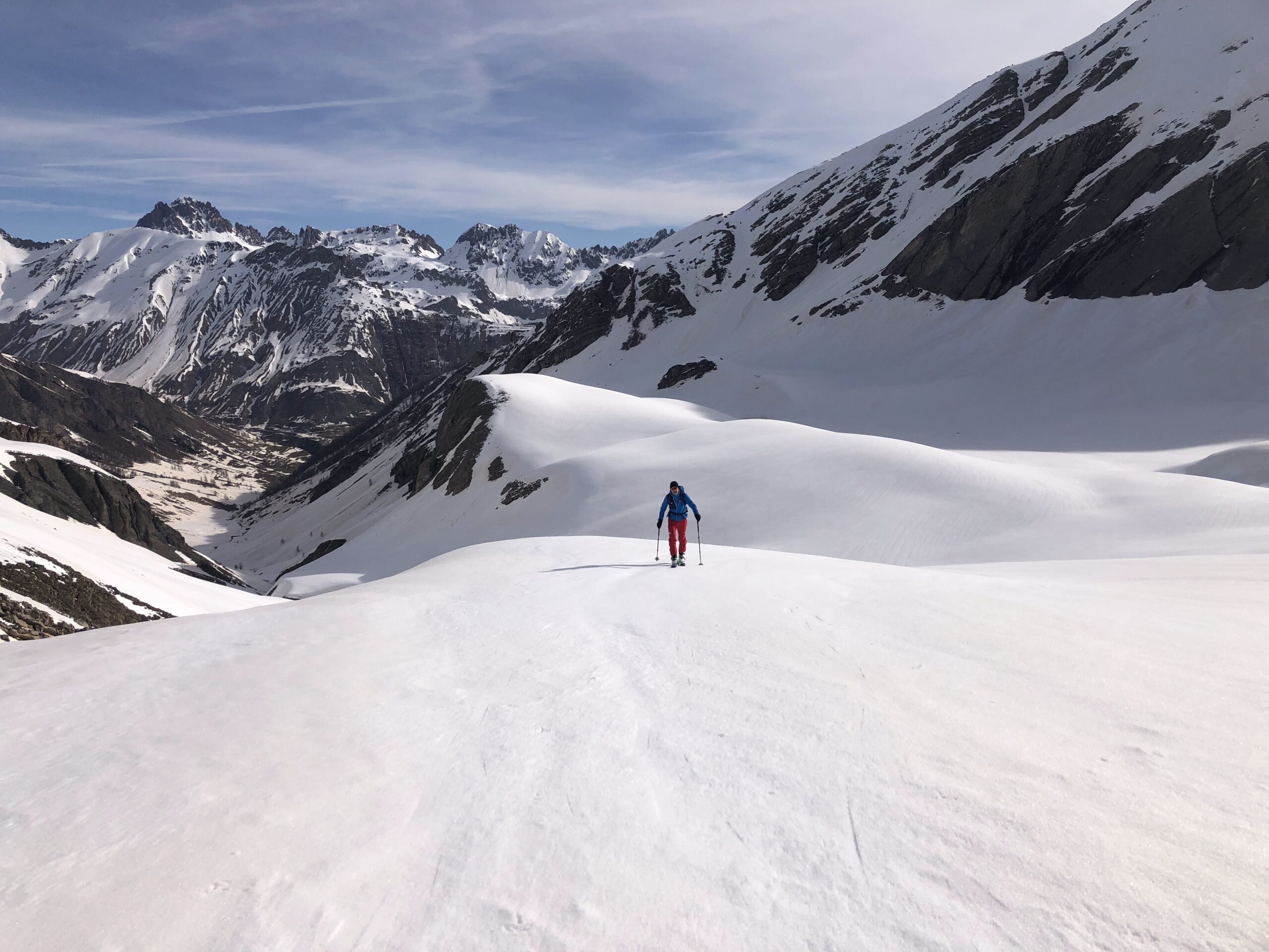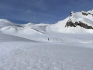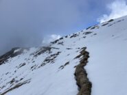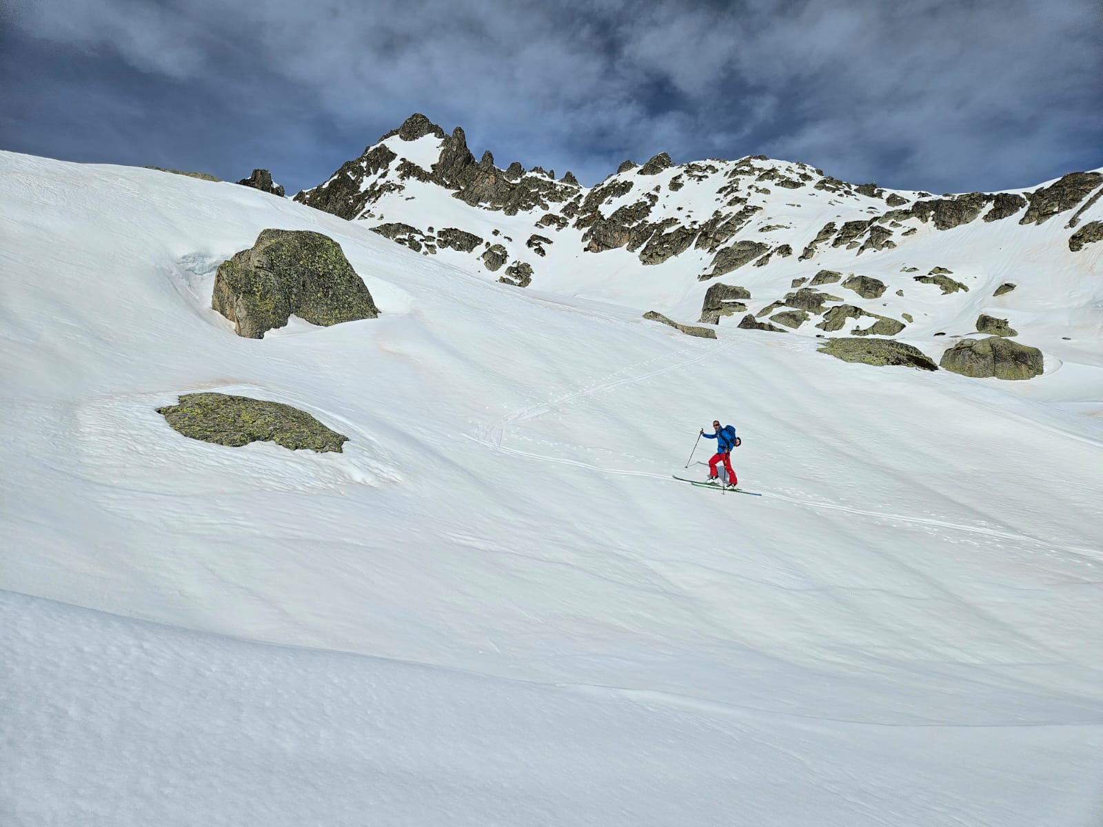 La neve parte dal Rifugio, un po’ molle che faticava l’andatura, il canale parte subito deciso, 45’ Max ma sempre costante, punta a 5 min…