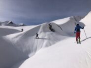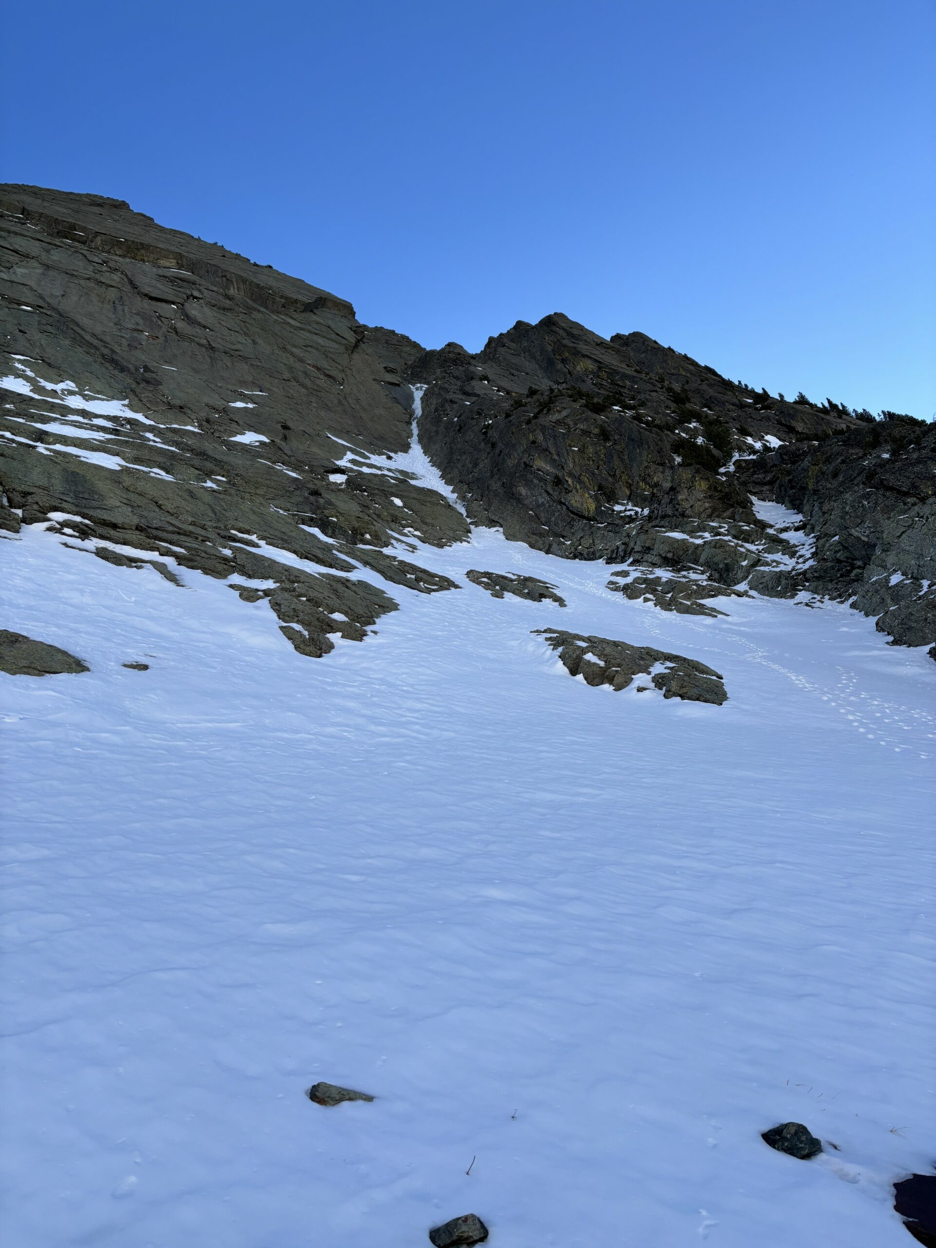 La neve parte dal Laghetto, canale tutto innevato tranne un punto centrale, giusto per il riposo..... Il masso incastrato e ancora coperto, dal colletto neve continua…