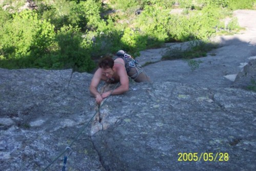 Bellissima sequenza di placche movimentate da qualche piccolo tetto e da utili spigolini. Roccia molto bella specie dal secondo tiro.
