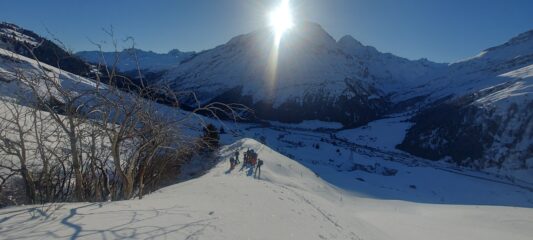Partiamo alle 7 30 da Meien con temperatura sopra zero e vento in valle. Appena la luce illumina le cime, capiamo subito che verso la Rohrspitzli…
