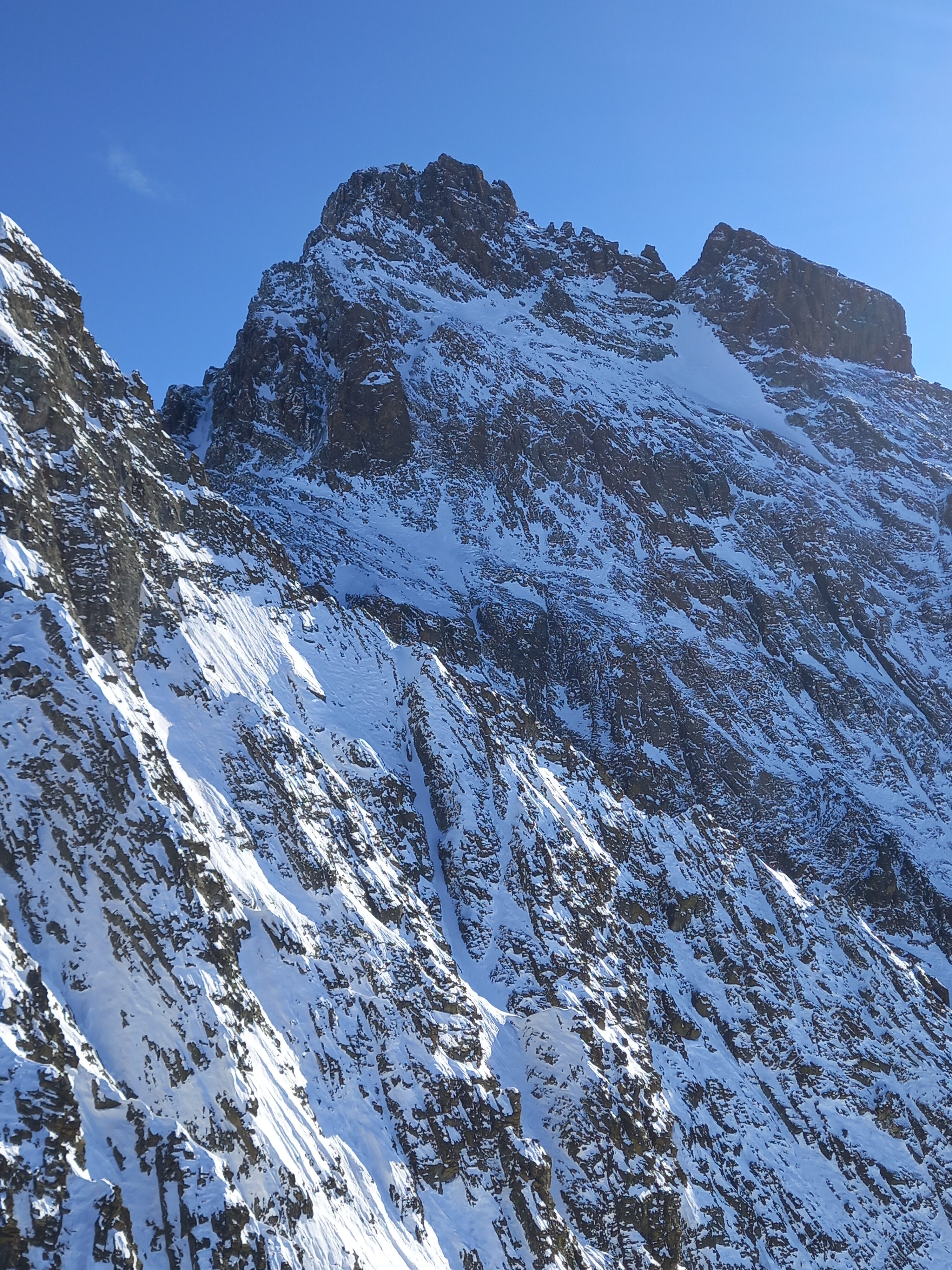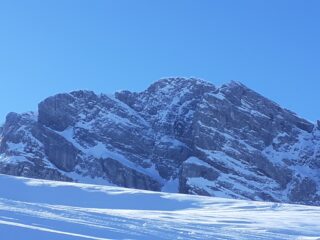 Avvicinando comodo su ottima traccia fin sotto le vie di arrampicata sul triangolo, poi buona fino al vallanta. Da lì in su crosta da rigelo…