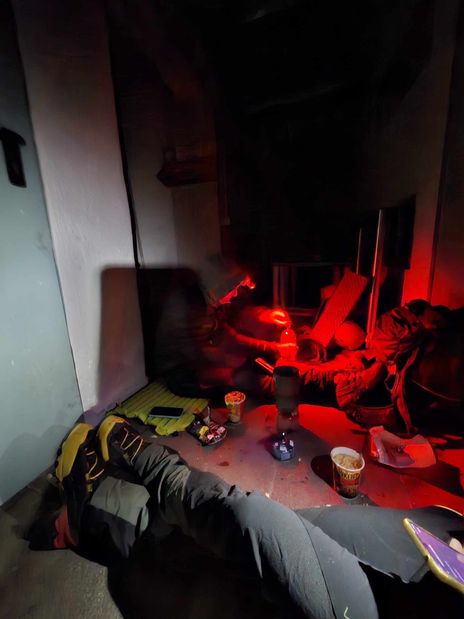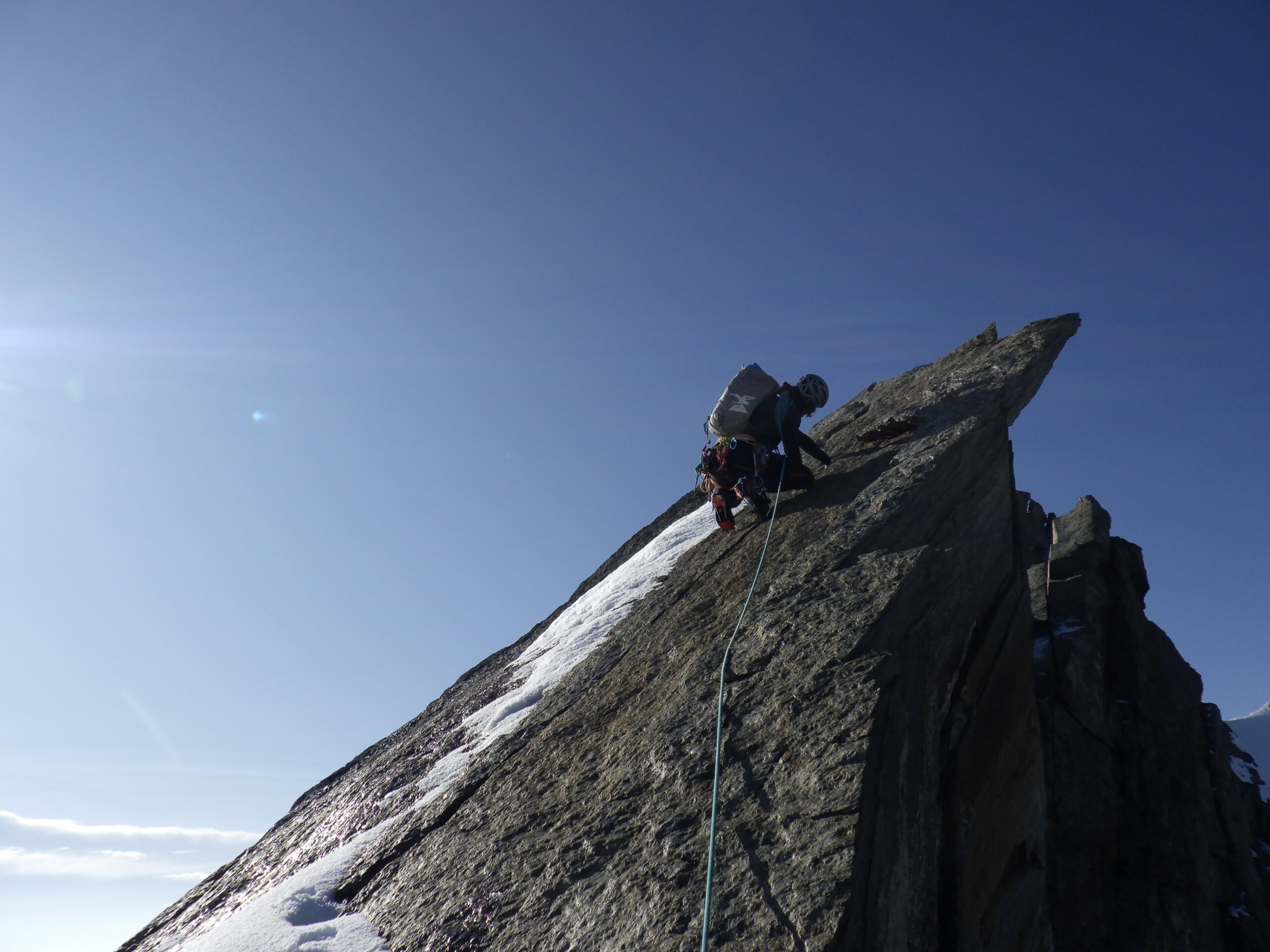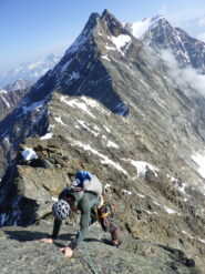 Cresta abbastanza pulita ma, complice il temporale notturno, percorsa tutta coi ramponi per evitare troppi cambi assetto. Solo noi sulla nord e qualche altra cordata…