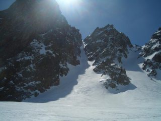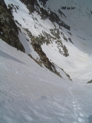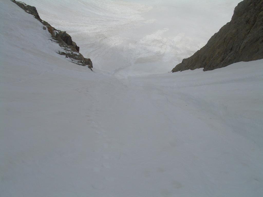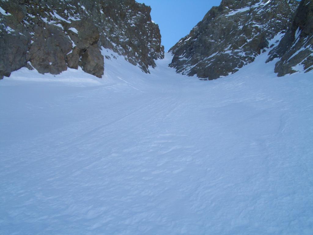 Canale retilineo con pendenza costante a 45°. Oggi si presentava con una profonda rigola centrale da metà in giù. Noi siamo scesi sulle contropendenze di…