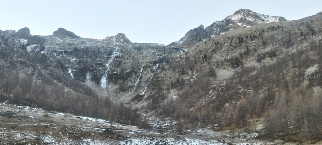 Cascata centrale del Valasco. Attualmente in buone condizioni e ben formata tenendo la linea di dx. Rispetto alla relazione qui proposta alle condizioni attuali proponiamo: L1: canale obliquo…