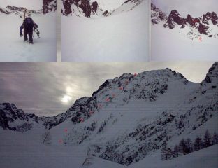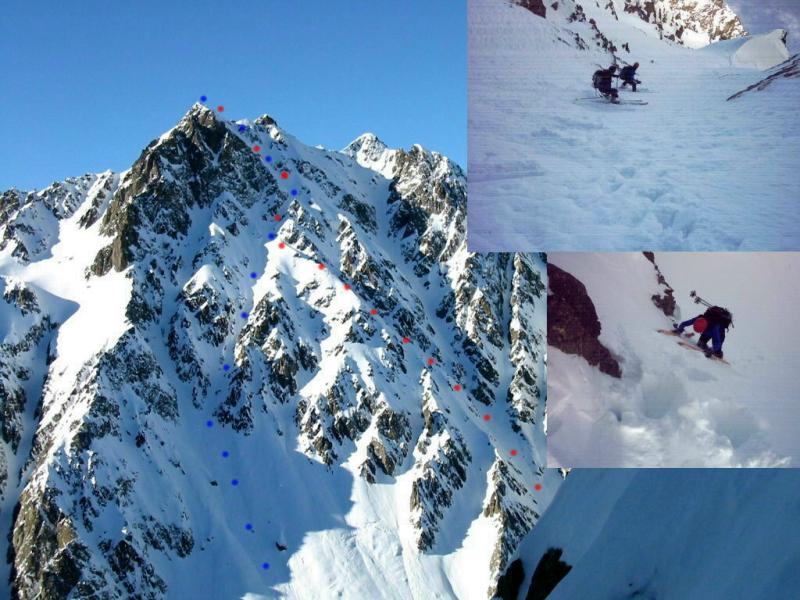 Probabile prima discesa in sci. Siamo saliti per il canale che guarda a sud-est,(puntini blu per la salita e rossi per la discesa) neve bruttina…