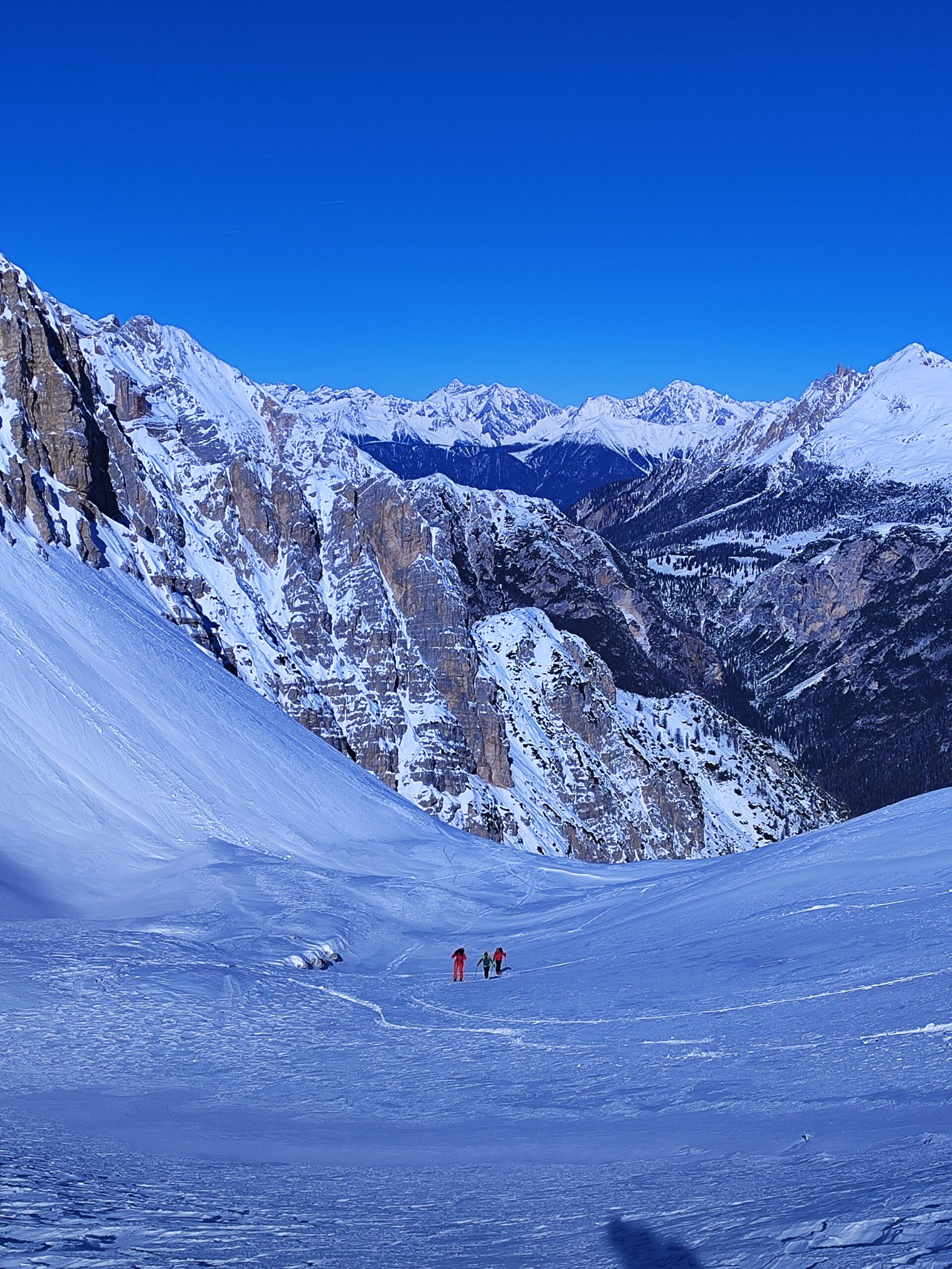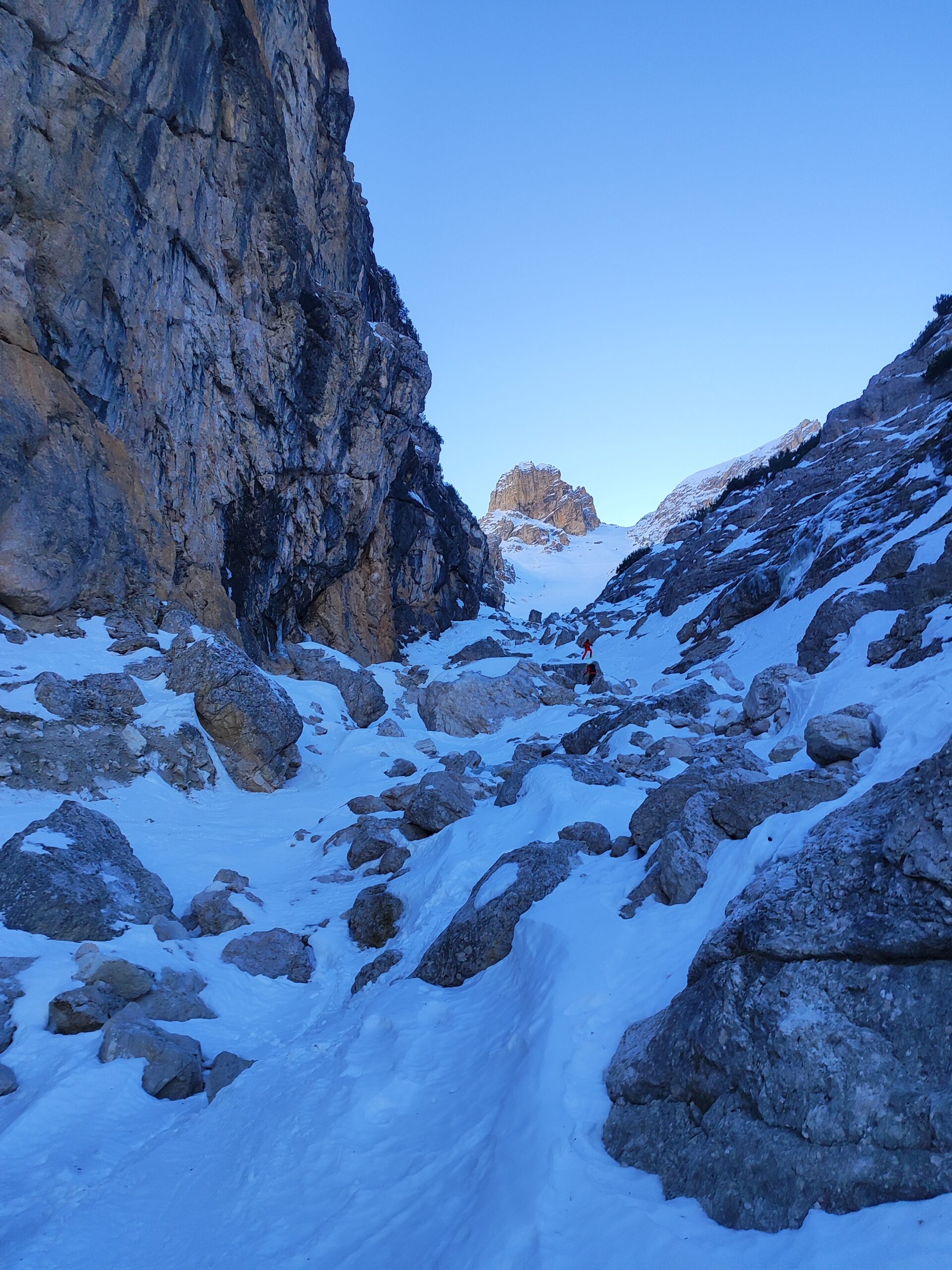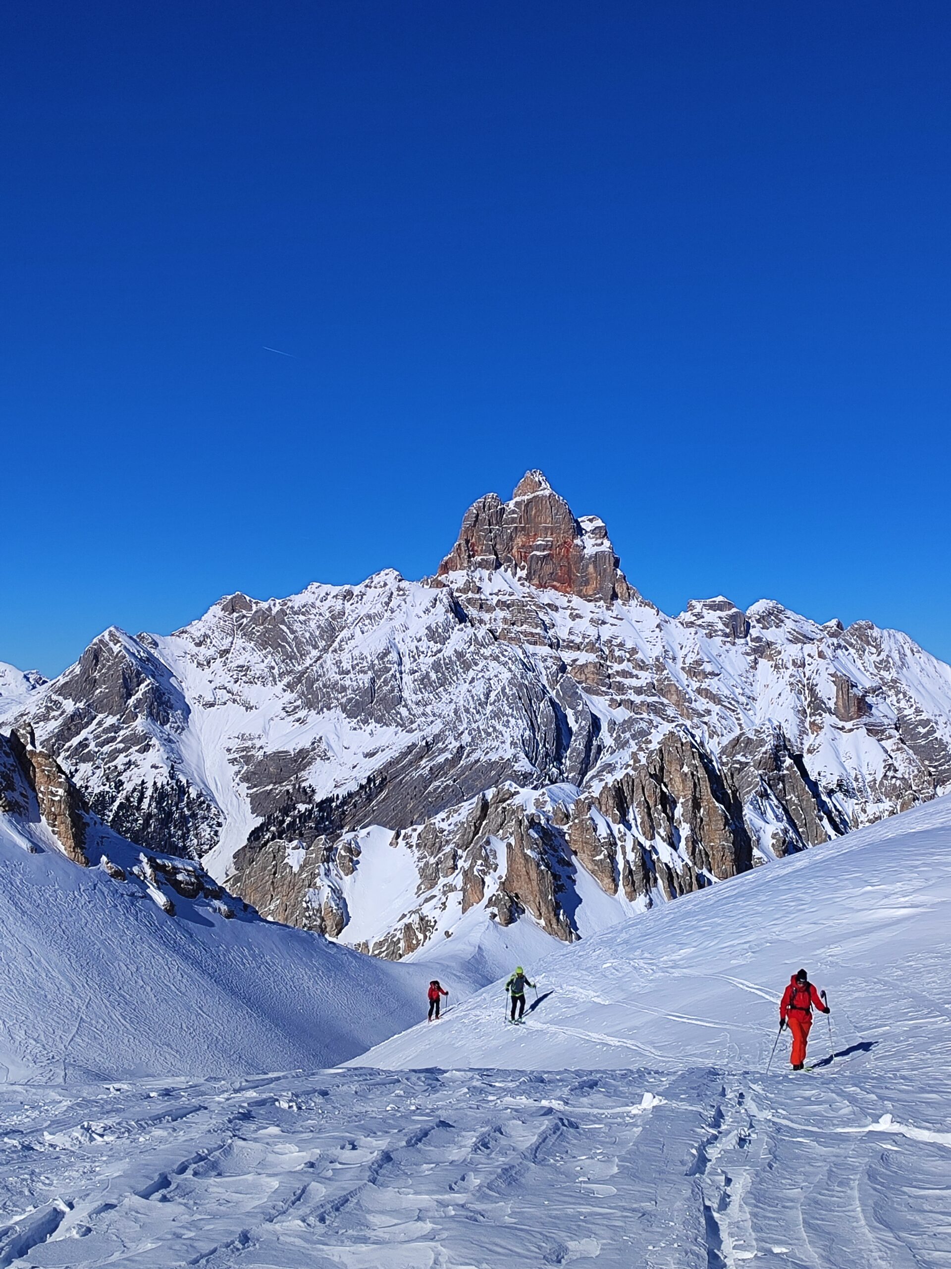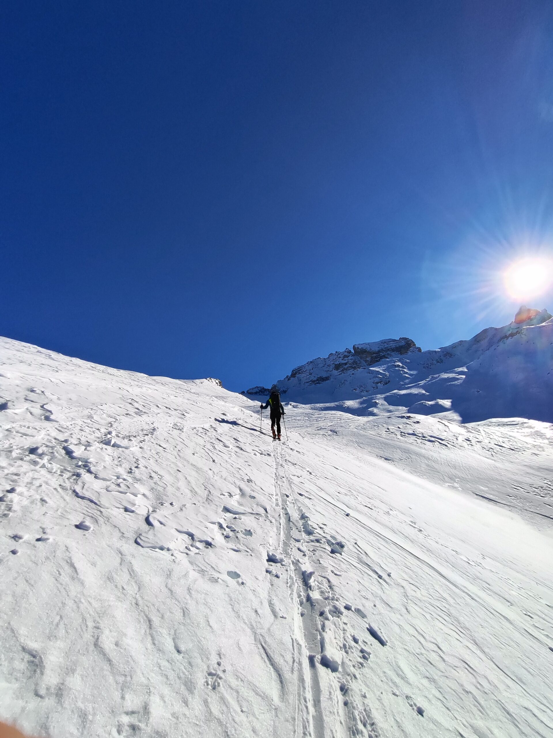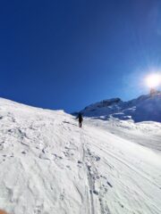Poca neve all'inizio c'è da ravanare sia in salita che in discesa (a volte necessario togliersi gli sci), una volta passato il canale neve ventata…