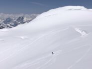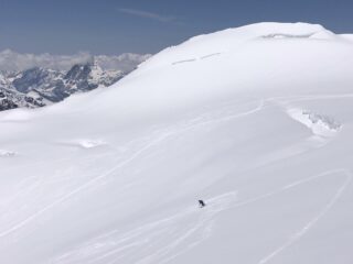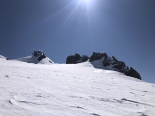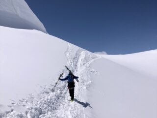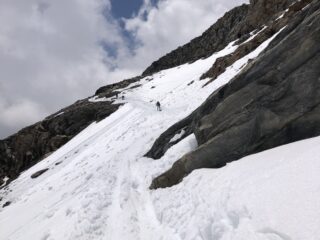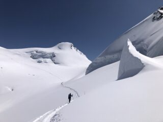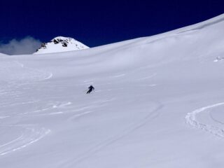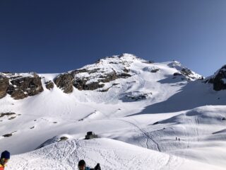 Gita effettuata in giornata con la prima funivia. Ottime condizioni di innevamento su tutto il percorso: buon rigelo nei canali che superano la barra rocciosa…