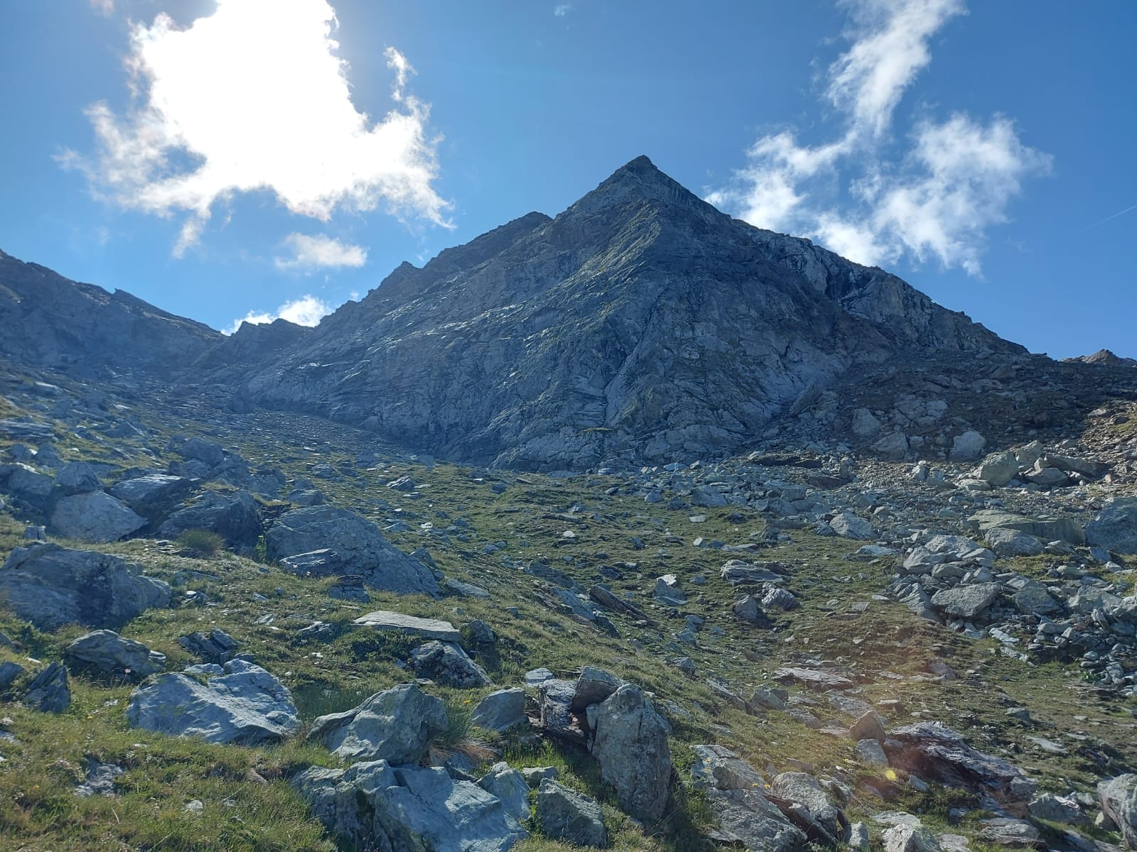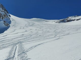 Saliti seguendo la traccia presente che fa il giro largo seguendo il vallone.Arrivati nei piani superiori, vedendo la punta completamente senza neve tagliamo a destra…