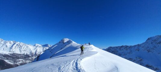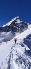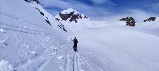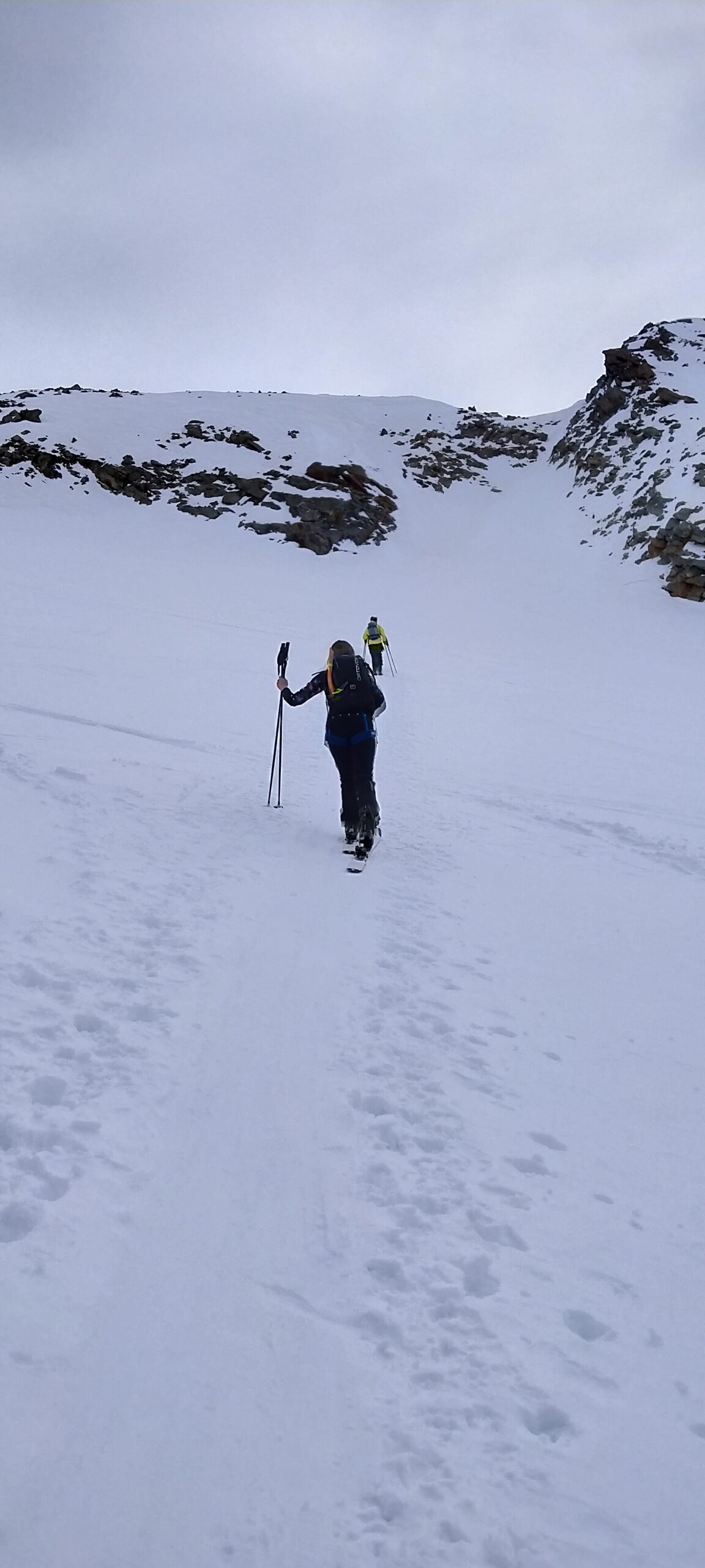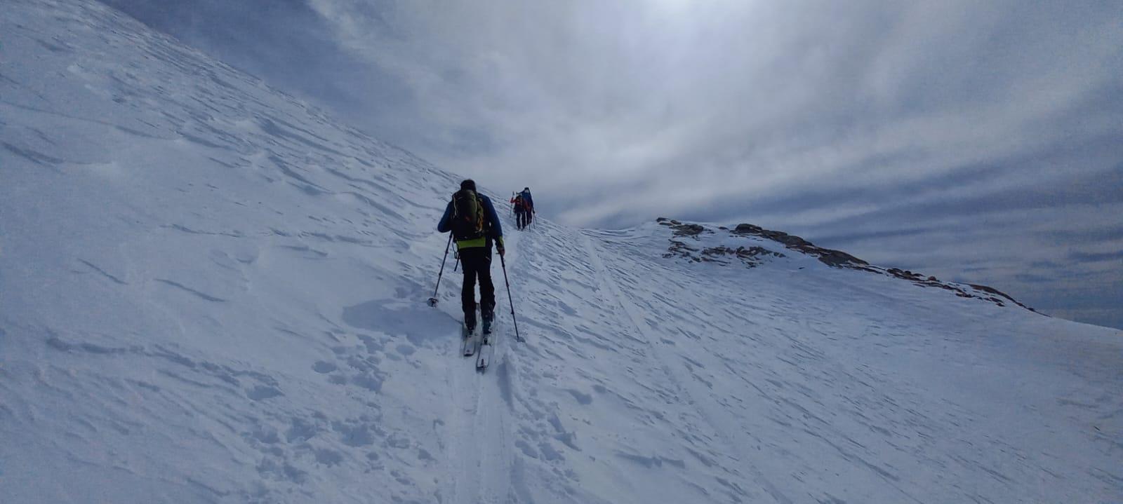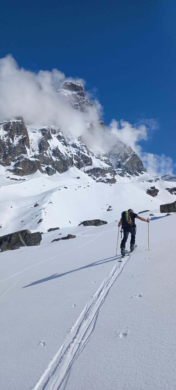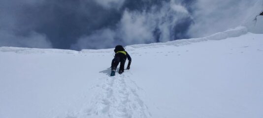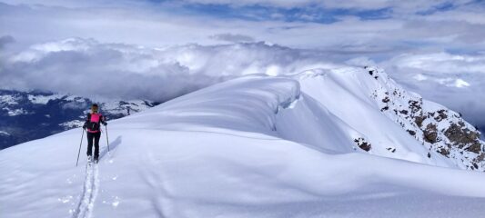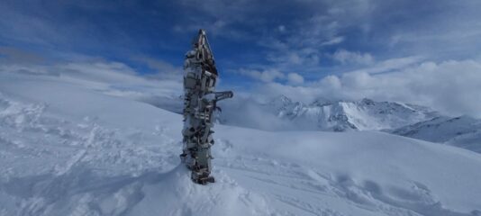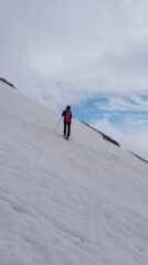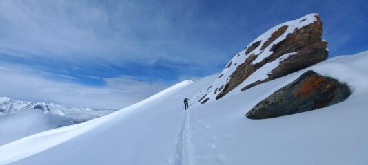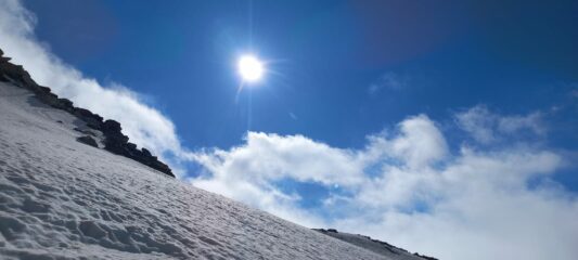 Partiti da Cretaz dove è possibile ancora muoversi sci ai piedi senza portage. Giornata inizialmente buona con temperature molto miti, ma con nuvoloni in…