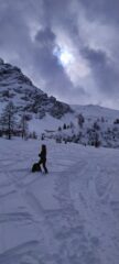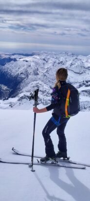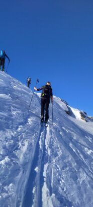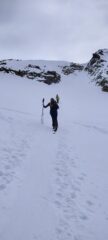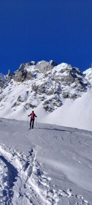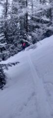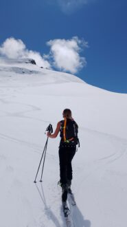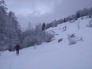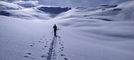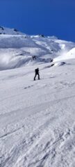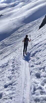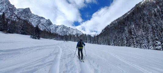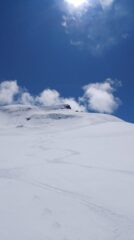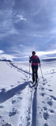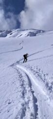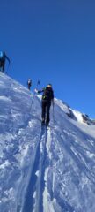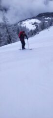 Bella giornata di sole, si parte senza problemi sci ai piedi dalla stradina, con neve piuttosto ghiacciata e solcata. Salendo, la neve è…