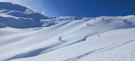 Alla ricerca del posto migliore dove trovare un po' di sole , decidiamo per il Vallone di Flassin, anche incoraggiati dalla presenza di alcuni scialpinisti…