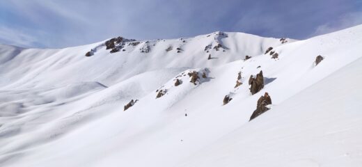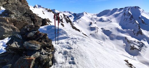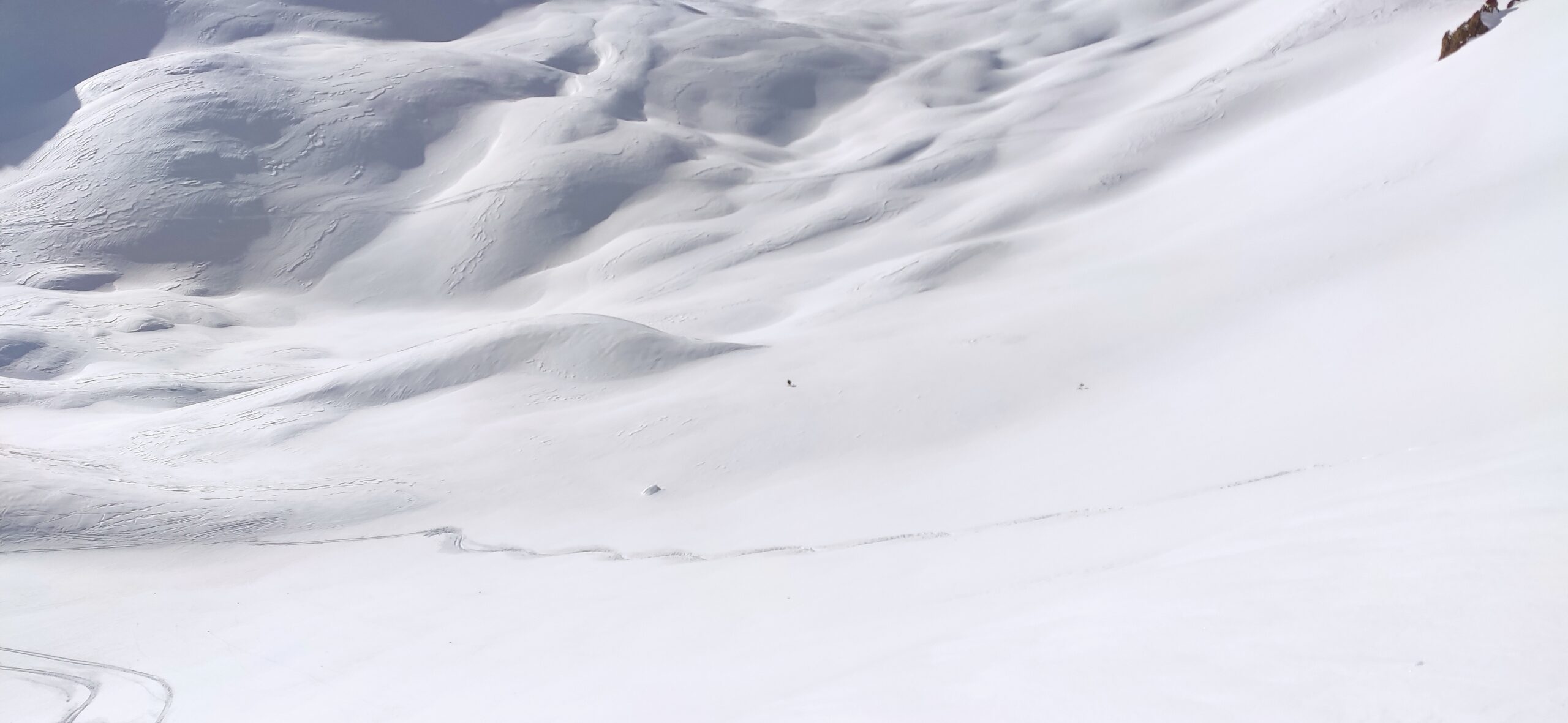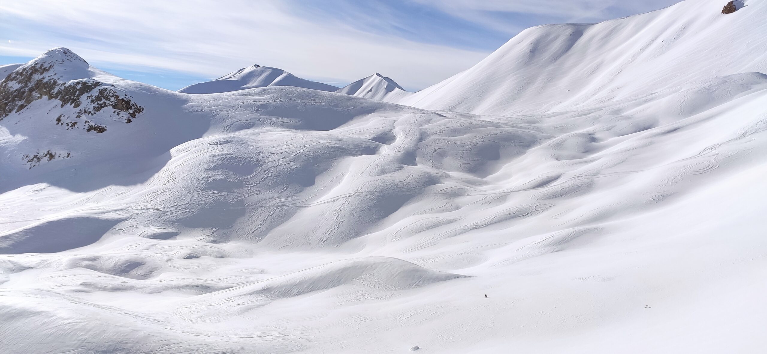 Si parte sci ai piedi dal Village du Soleil percorrendo inizialmente la stradina con neve sufficiente per salire, per scendere si toccherebbero alcune pietre coperte…