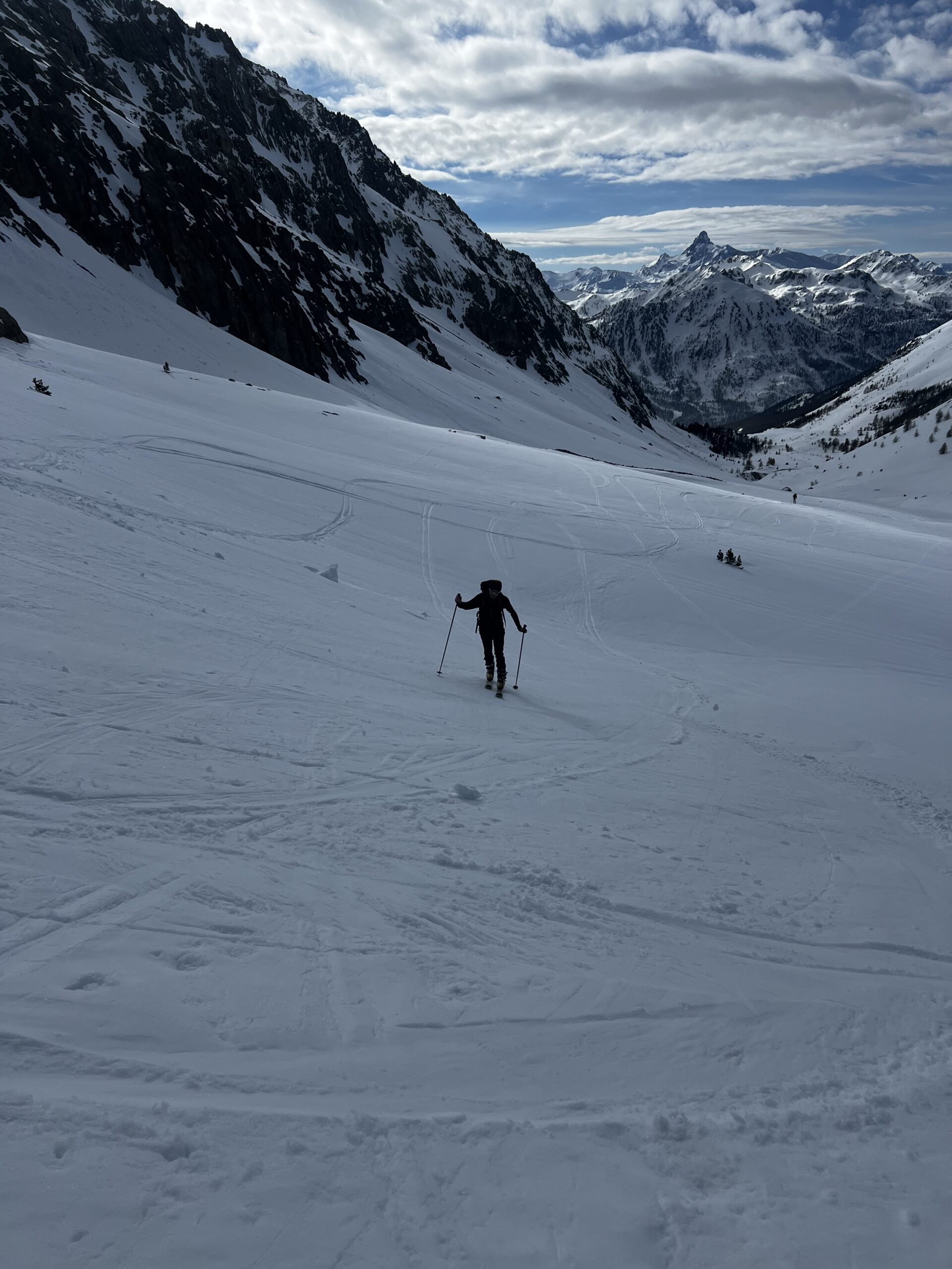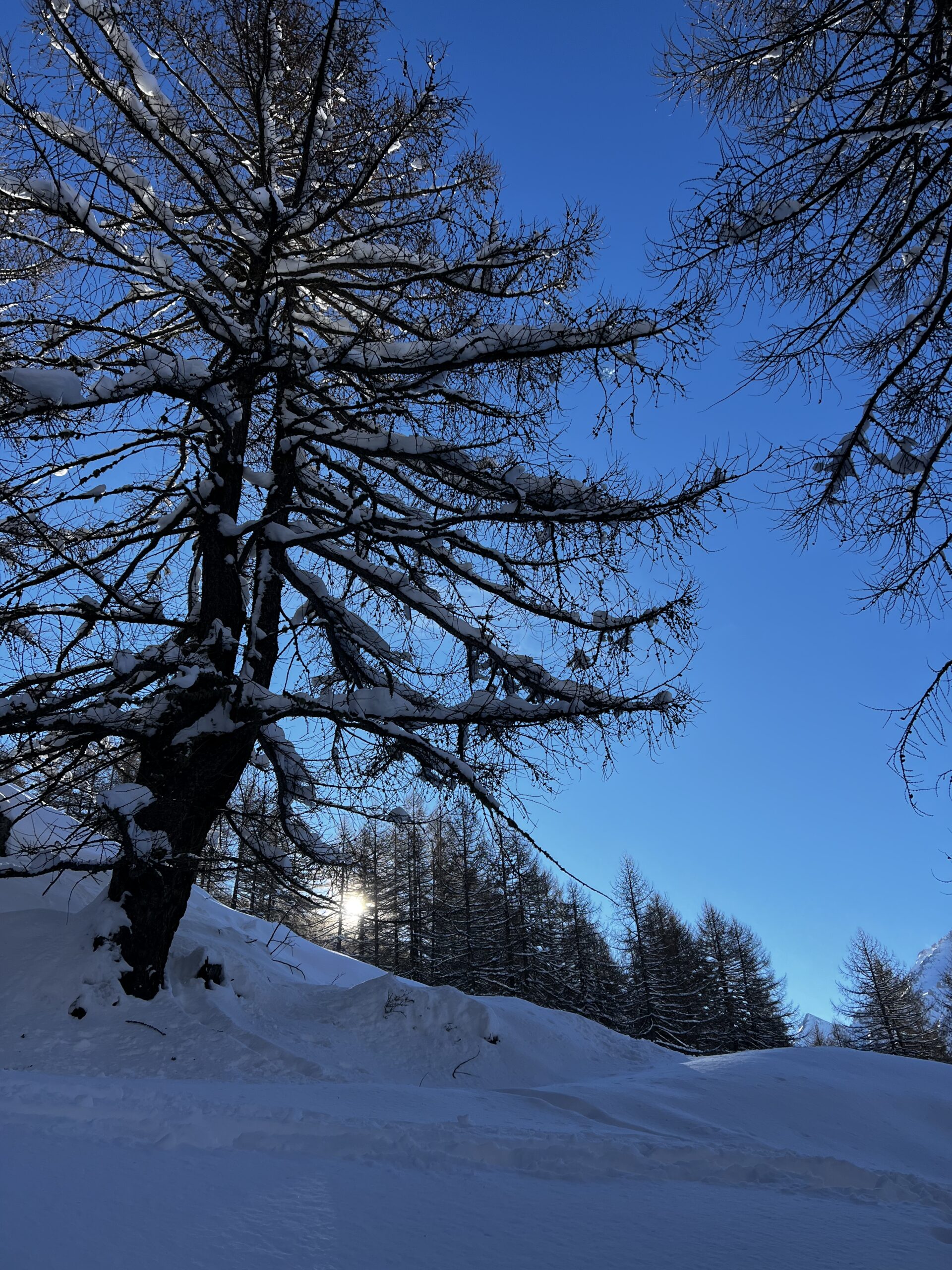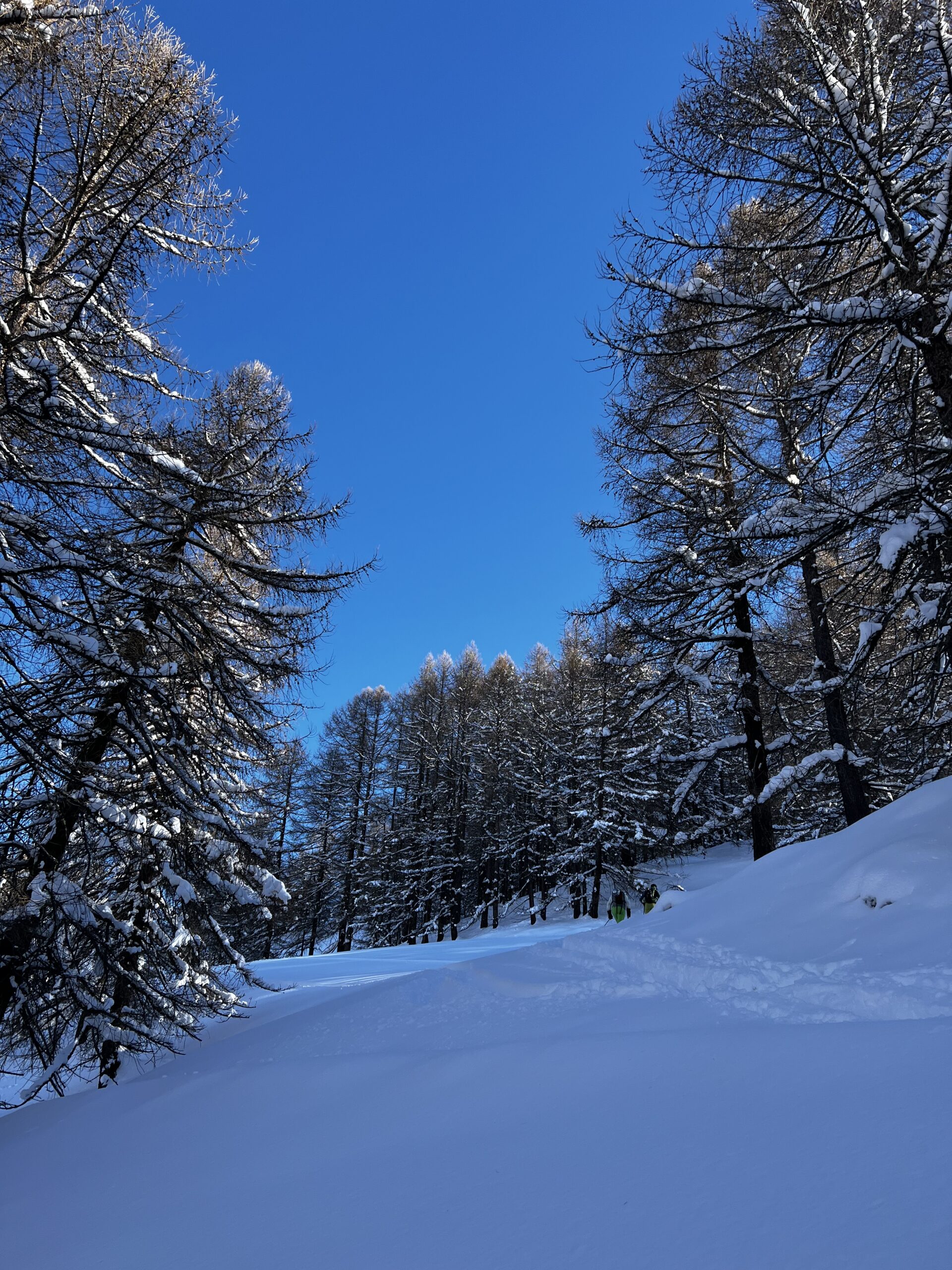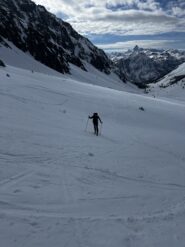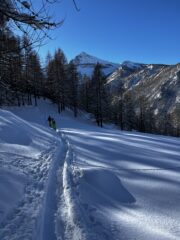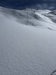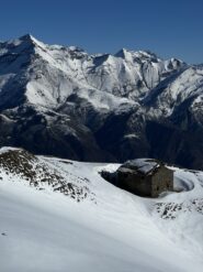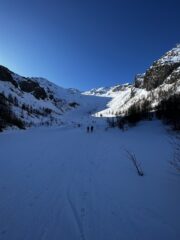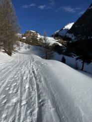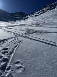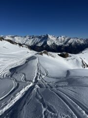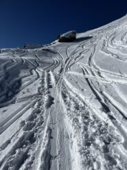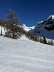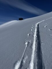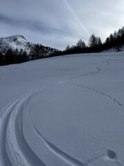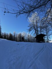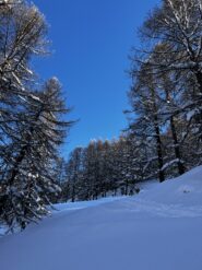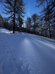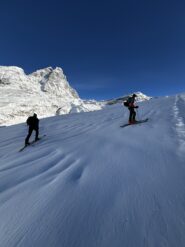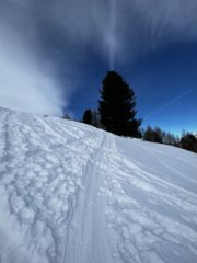 In partenza verso le 8.30 c’erano -13 gradi. In discesa su alcuni pendii al sole cominciava a formarsi un po’ di crostina, tratti non male…