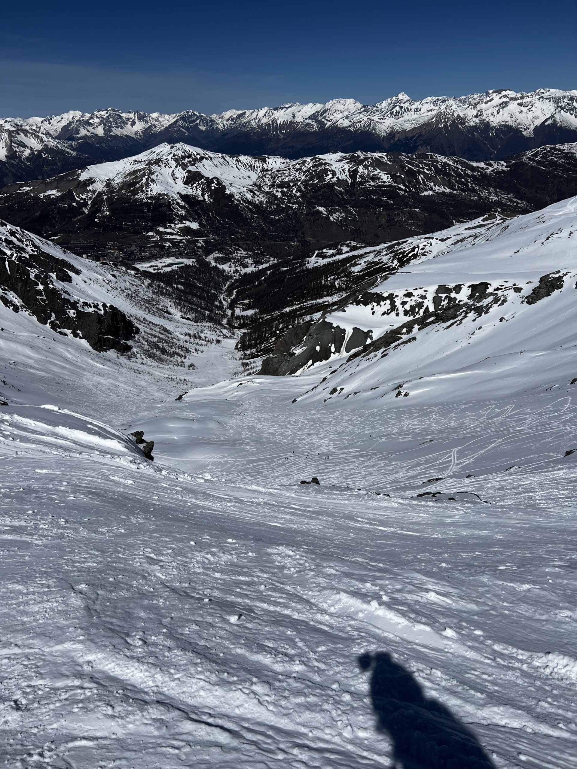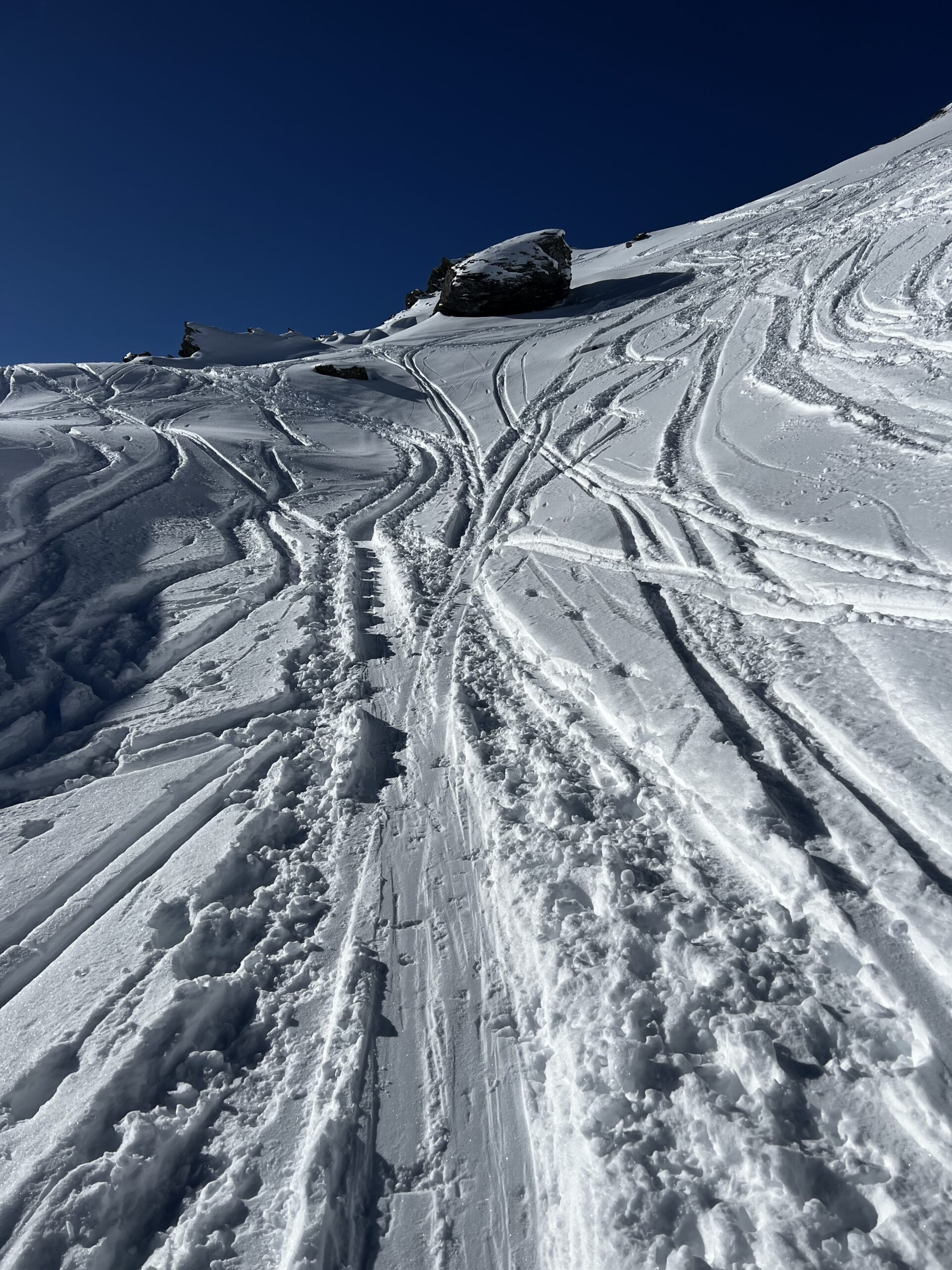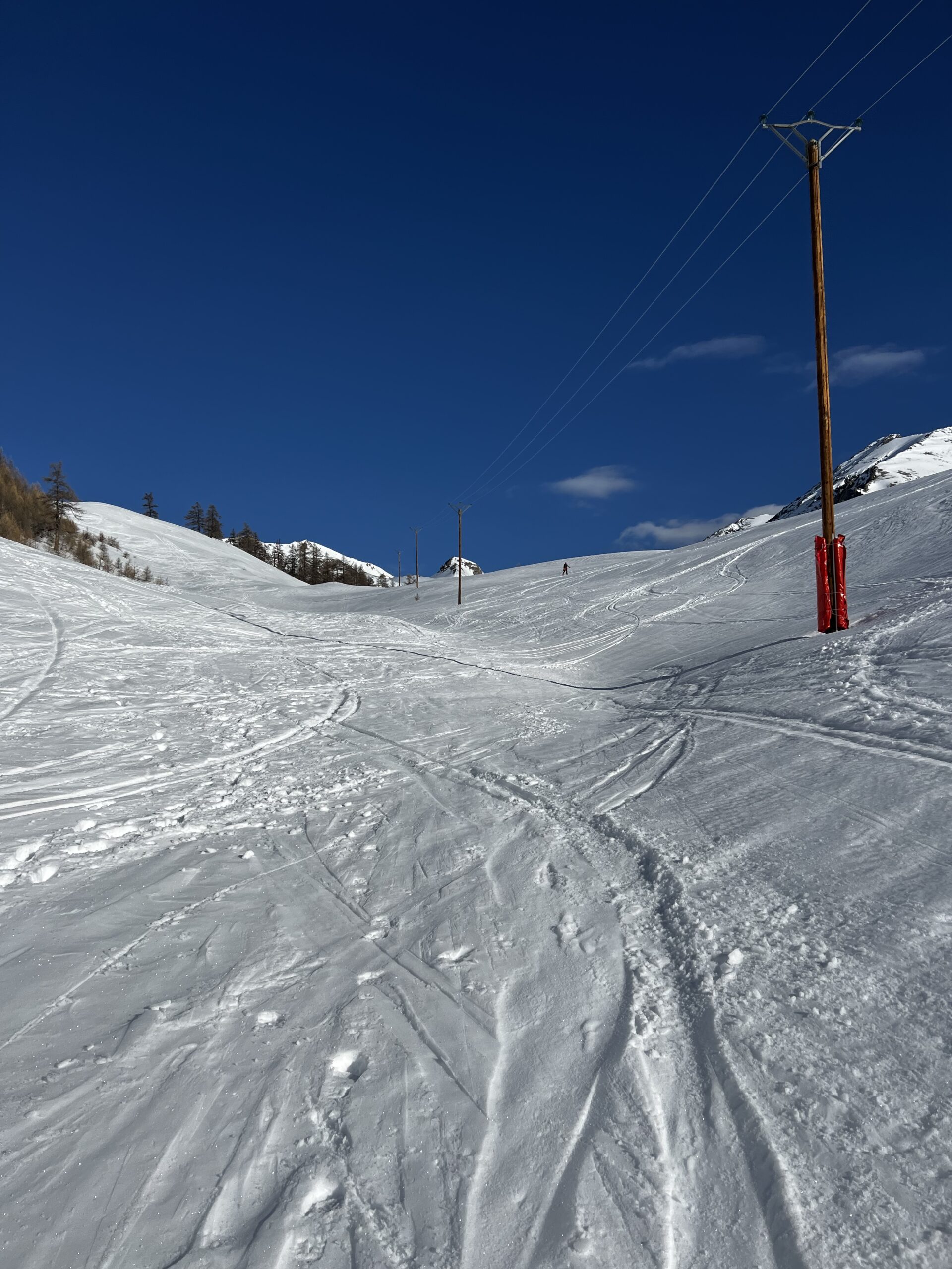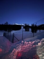 Serale fino in punta allo ski-lift. Sopra l’Intermedia e già tutta bella tracciata ma la neve è leggerissima quindi sciabilissima, dall’intermedia in giù ampi spazi…