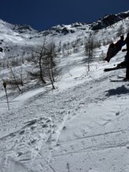 Arrivato all’intermedia. In discesa neve molto bella e scorrevole, ultimo tratto un po’ più pesante. Bella giornata di sole e caldo.