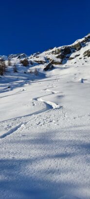 alla partenza neve appena sufficiente per arrivare fino a Mascognaz, poi neve su tutto il percorso. Tracciato fino a sotto al lago Perrin con 30 cm…