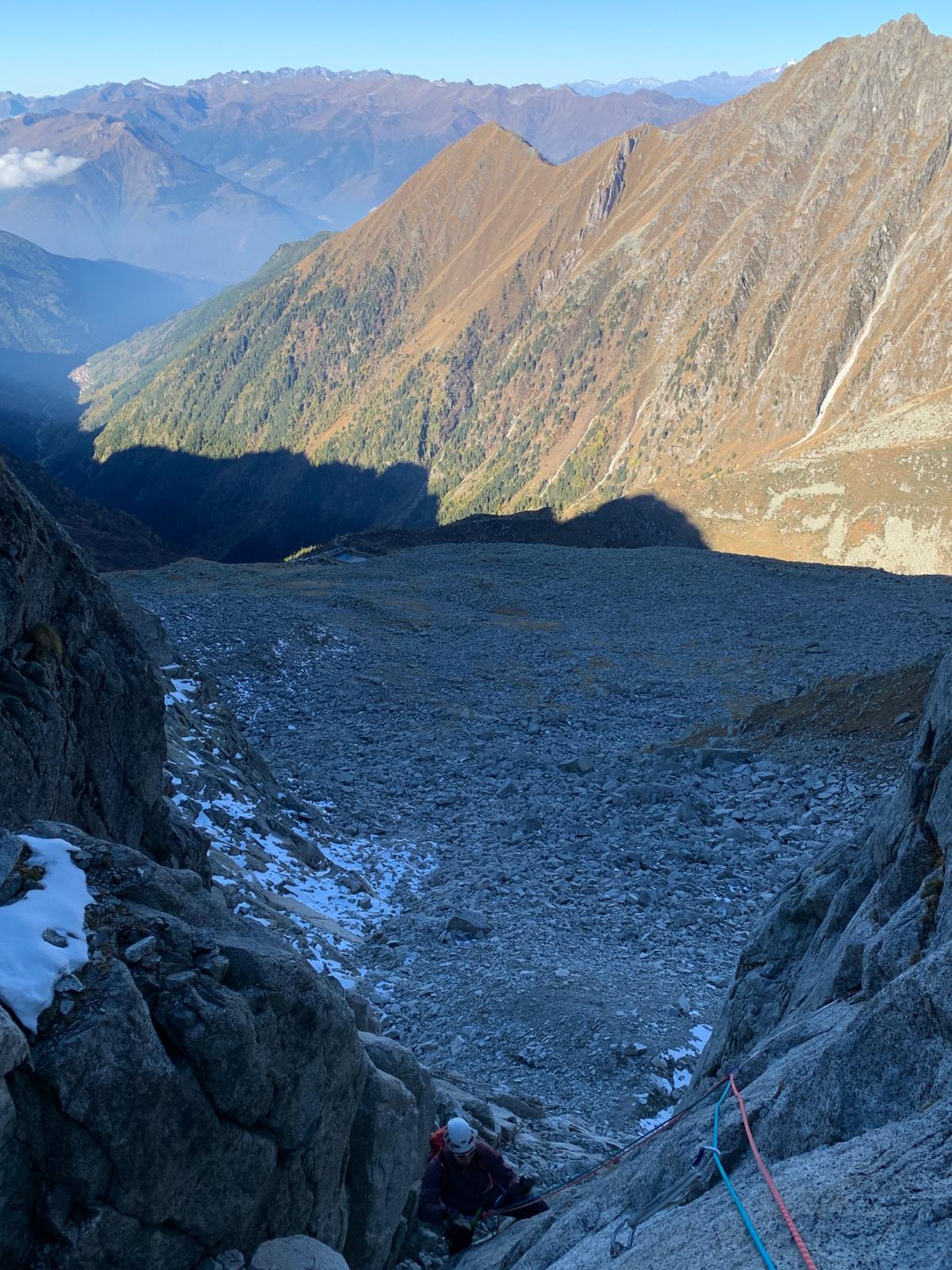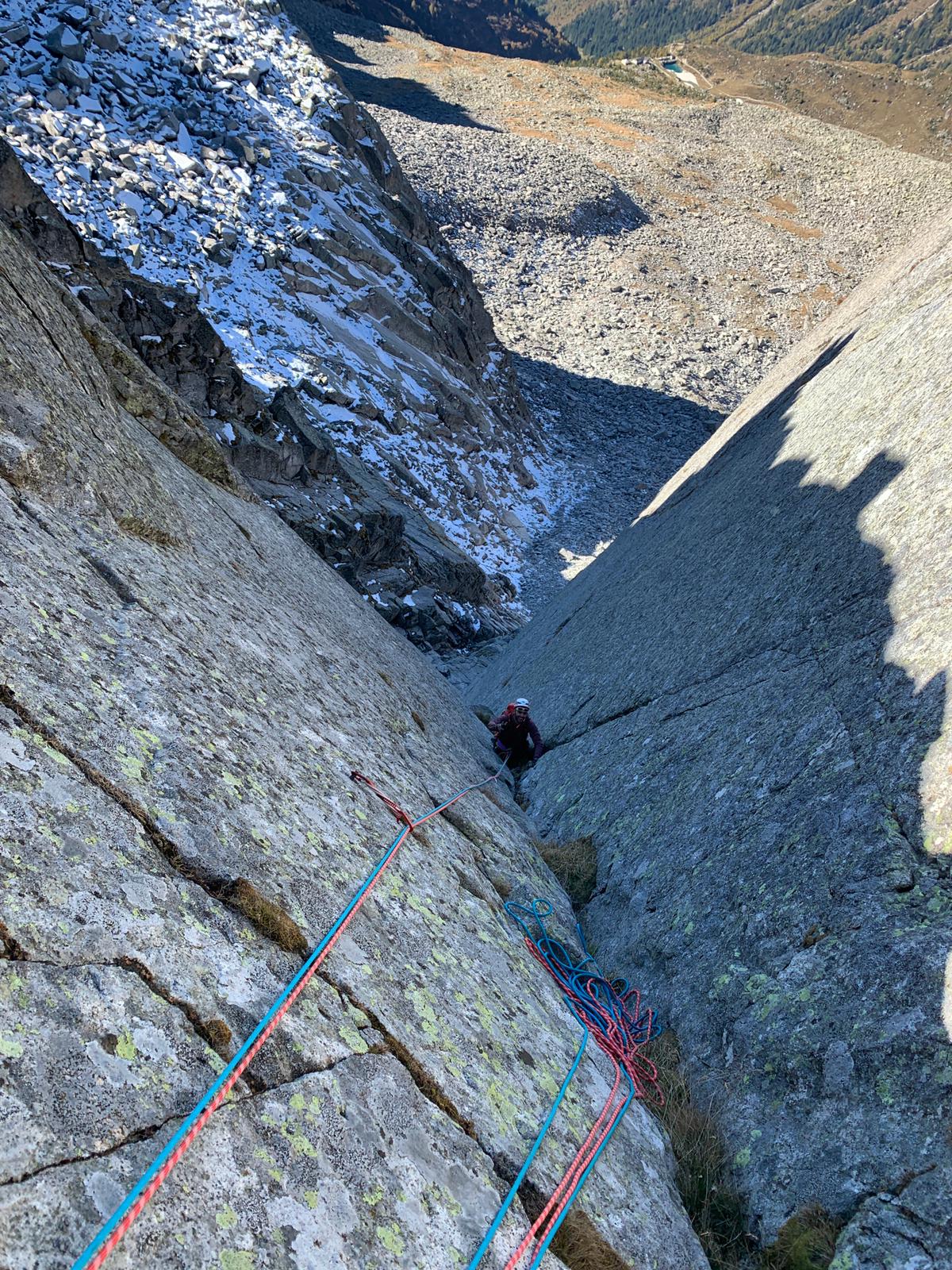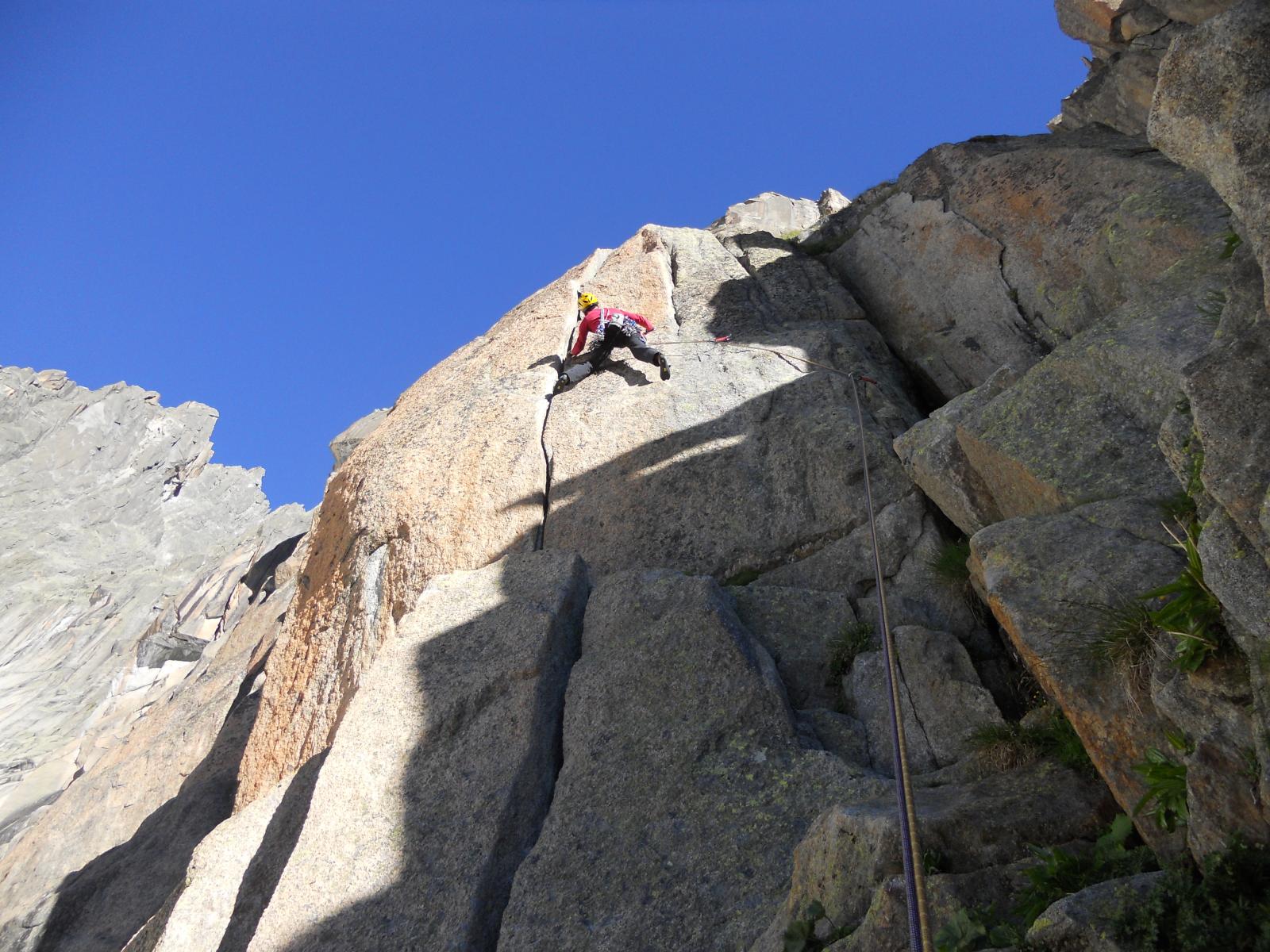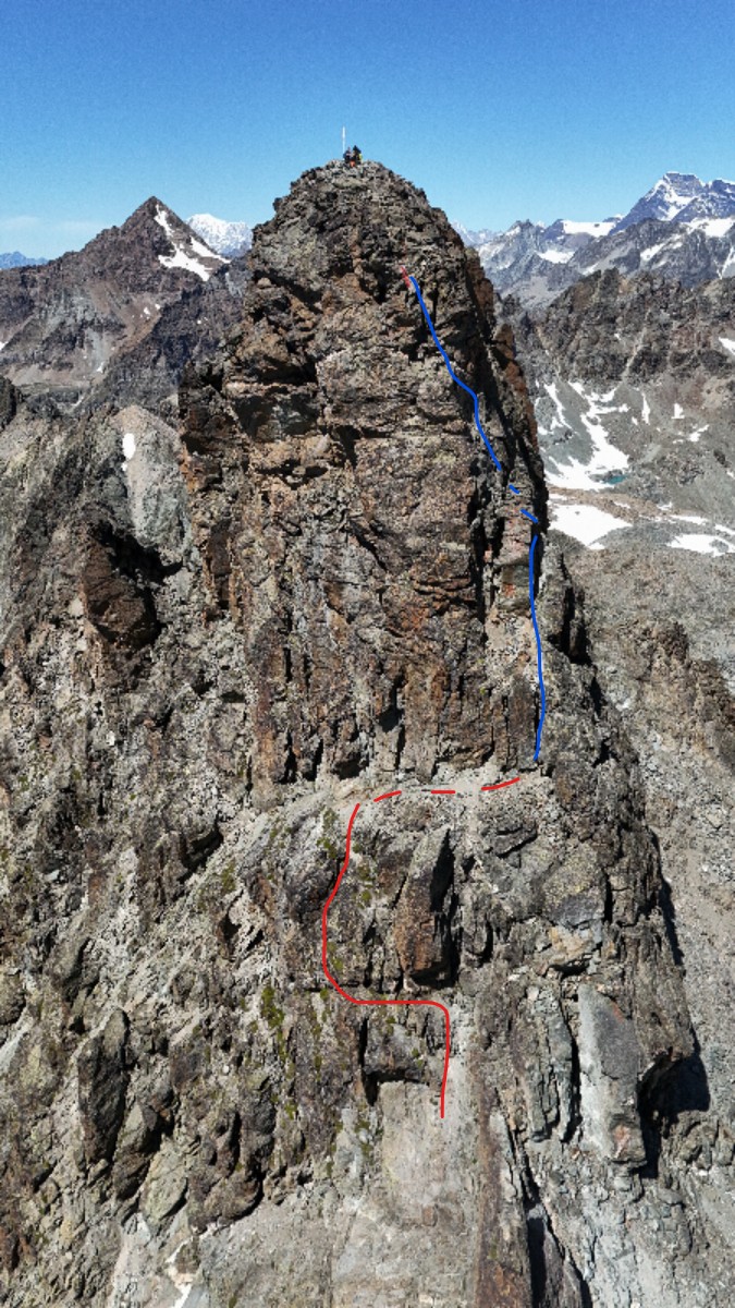 Blu: tiro che conduce in vetta (termina dalla sosta per calata) | dadoruggeri | Punta Tsan e la cresta Rey appena percorsa | dadoruggeri | Bivacco Rosazza | dadoruggeri | Uscita del canale | dadoruggeri | Mont Vélan | dadoruggeri | Panorama dalla vetta | dadoruggeri | Bivacco Rosazza | dadoruggeri | Ben visibili il canale e la cresta (sx) che porta in vetta la M. Cordine | dadoruggeri | | dadoruggeri | Attacco della via | dadoruggeri | L6