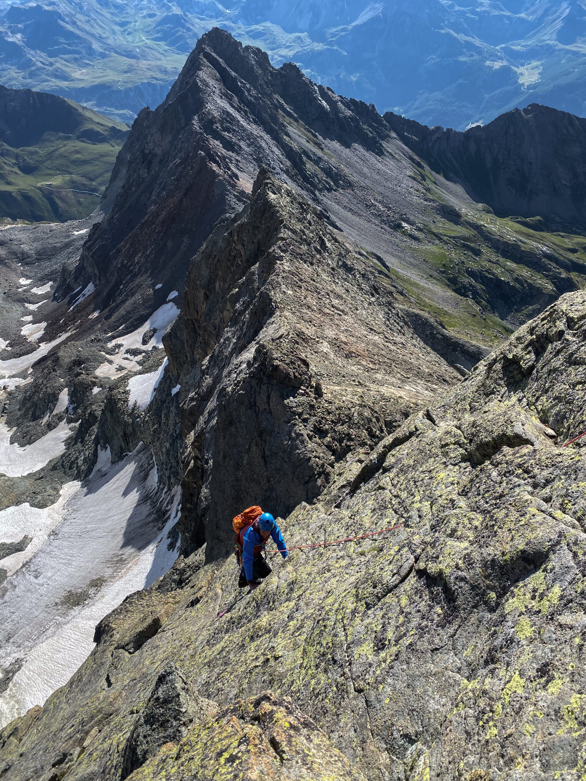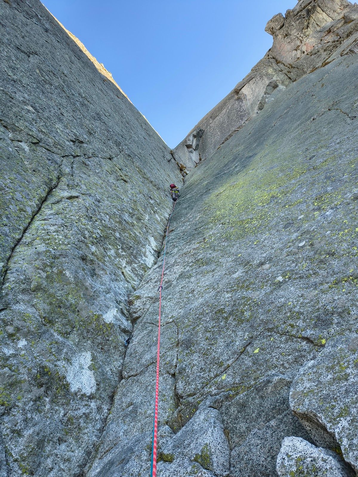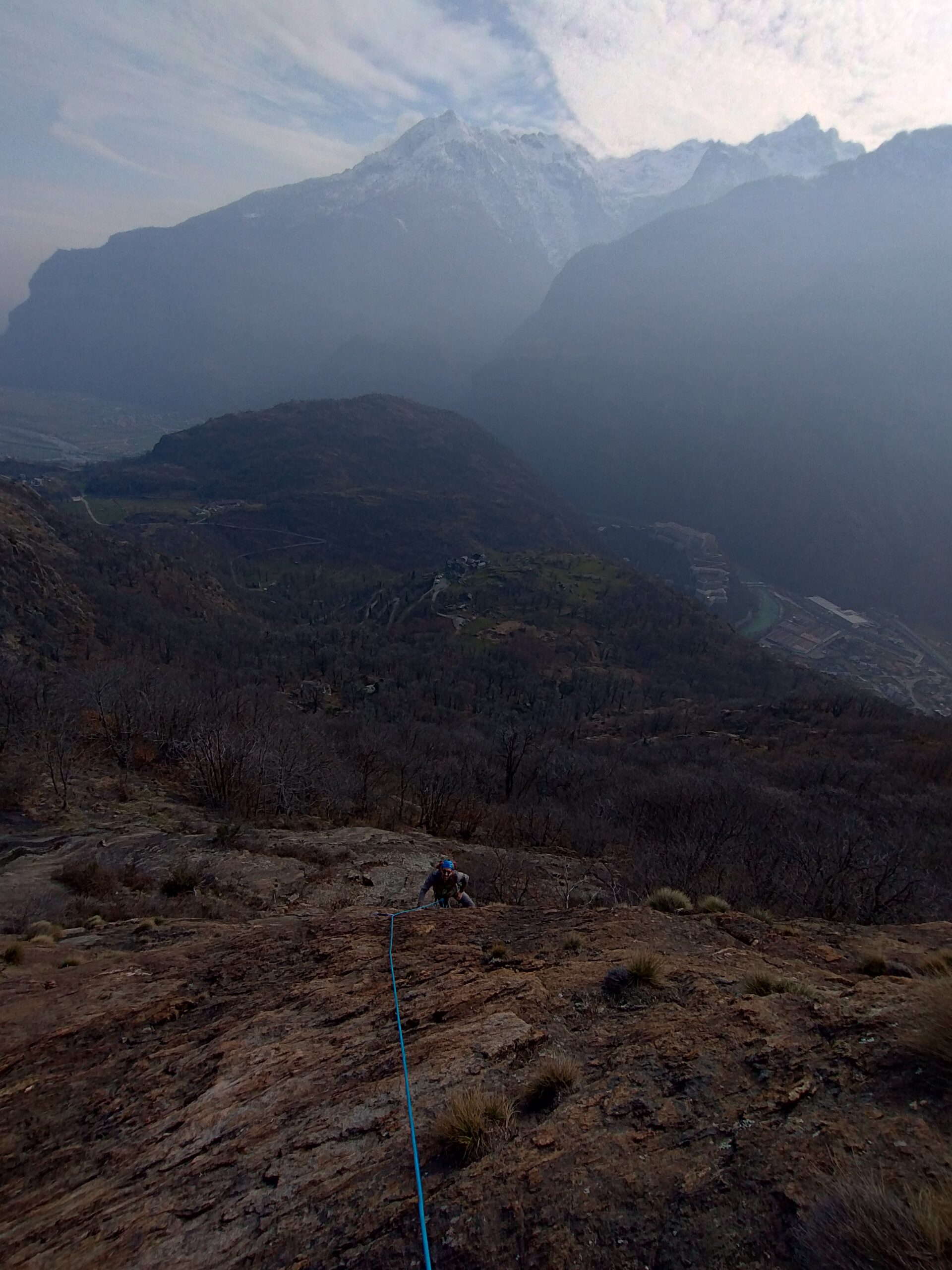 Blu: tiro che conduce in vetta (termina dalla sosta per calata) | dadoruggeri | Punta Tsan e la cresta Rey appena percorsa | dadoruggeri | Bivacco Rosazza | dadoruggeri | Uscita del canale | dadoruggeri | Mont Vélan | dadoruggeri | Panorama dalla vetta | dadoruggeri | Bivacco Rosazza | dadoruggeri | Ben visibili il canale e la cresta (sx) che porta in vetta la M. Cordine | dadoruggeri | | dadoruggeri | Attacco della via | dadoruggeri | L6