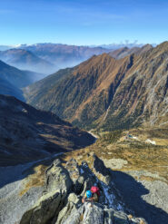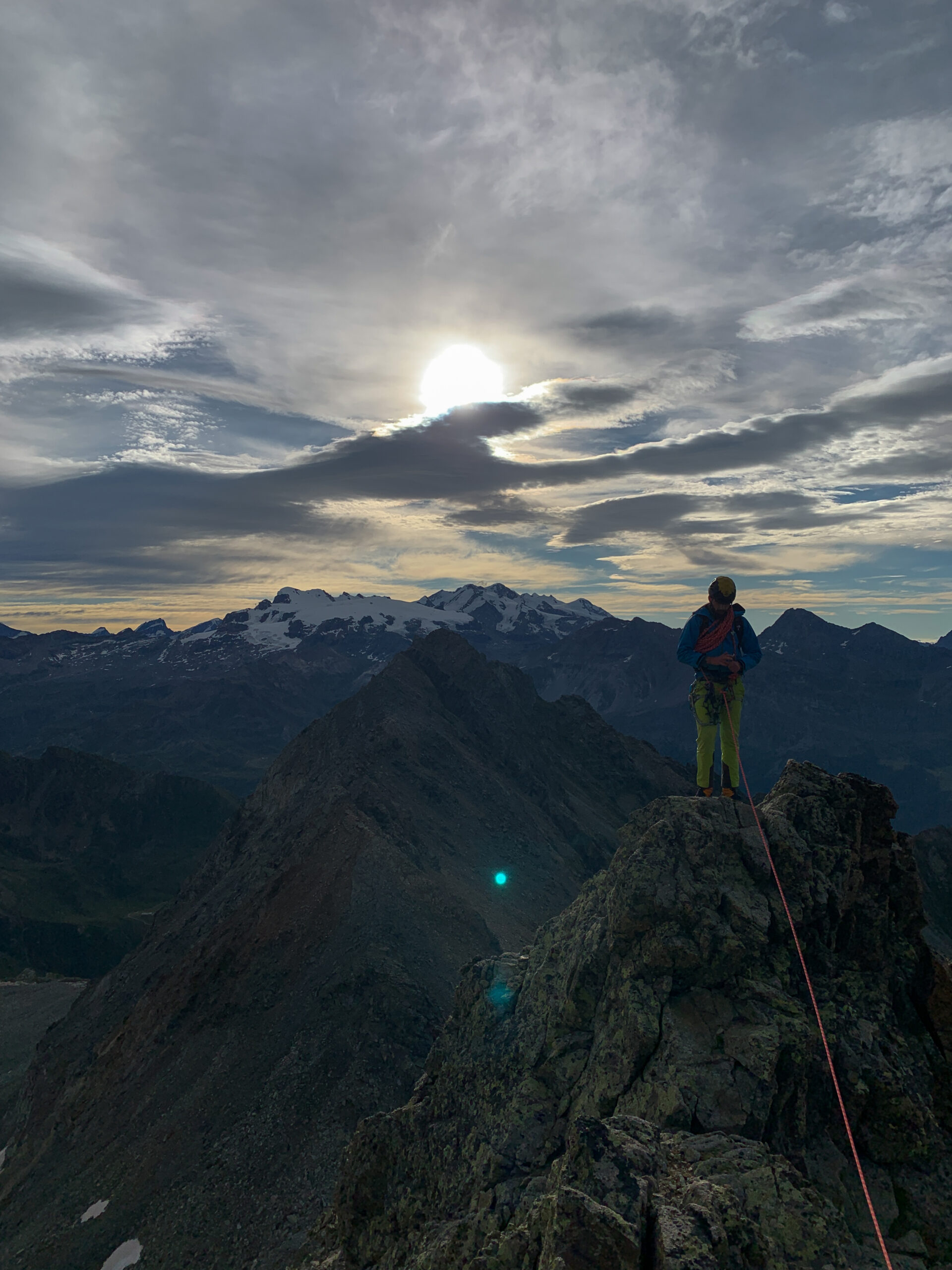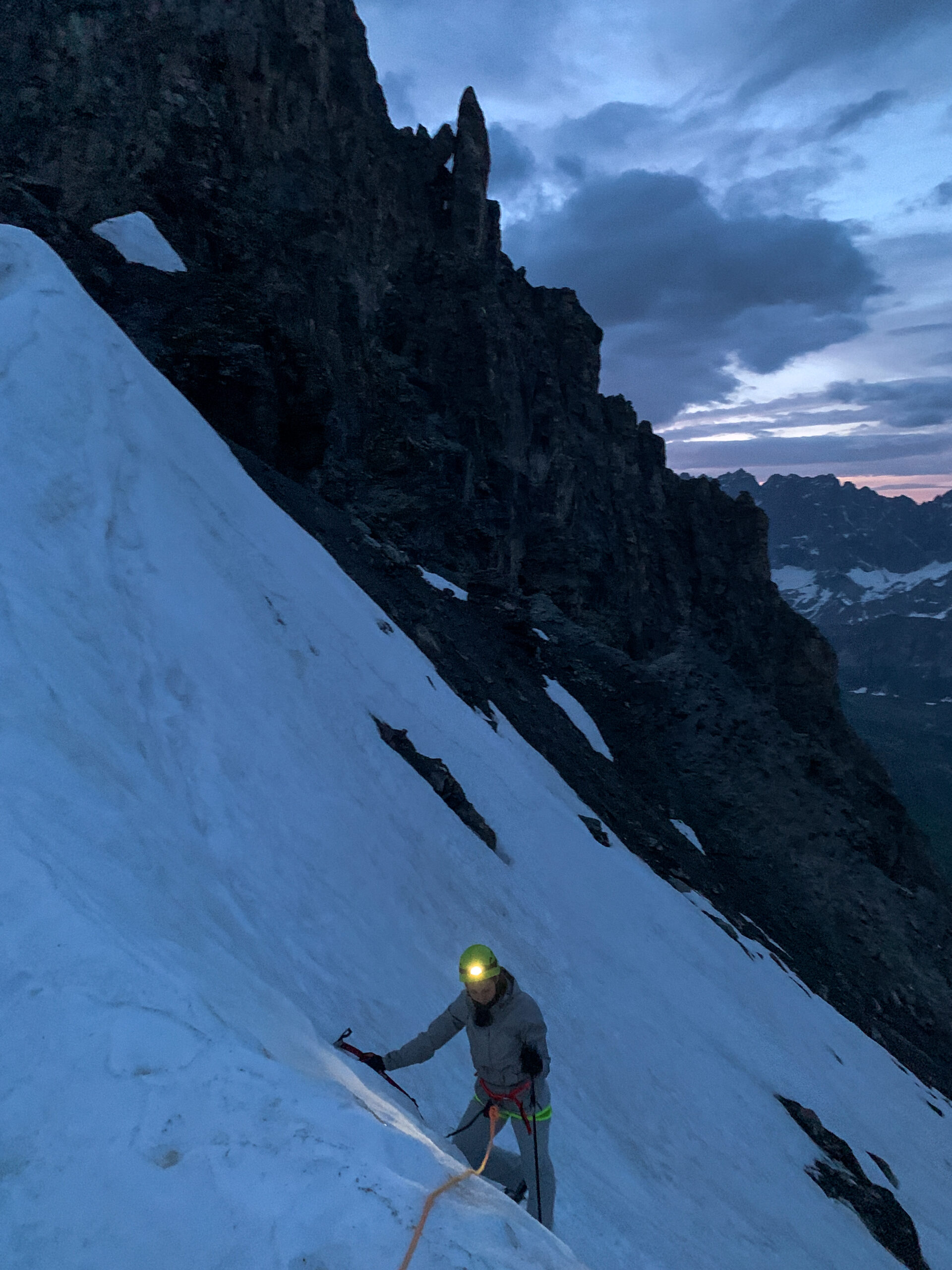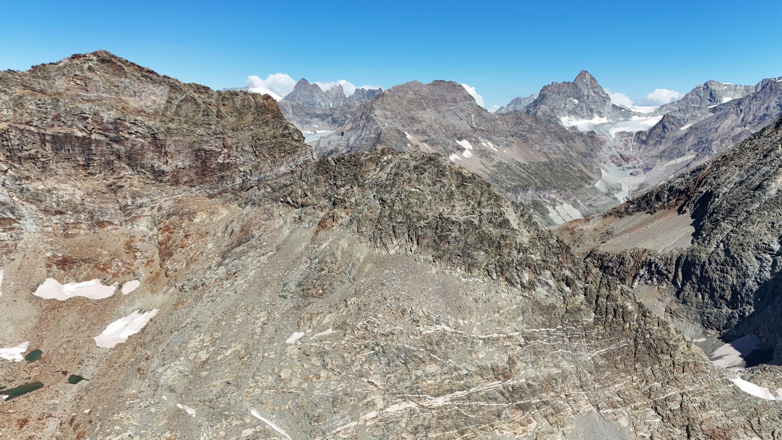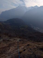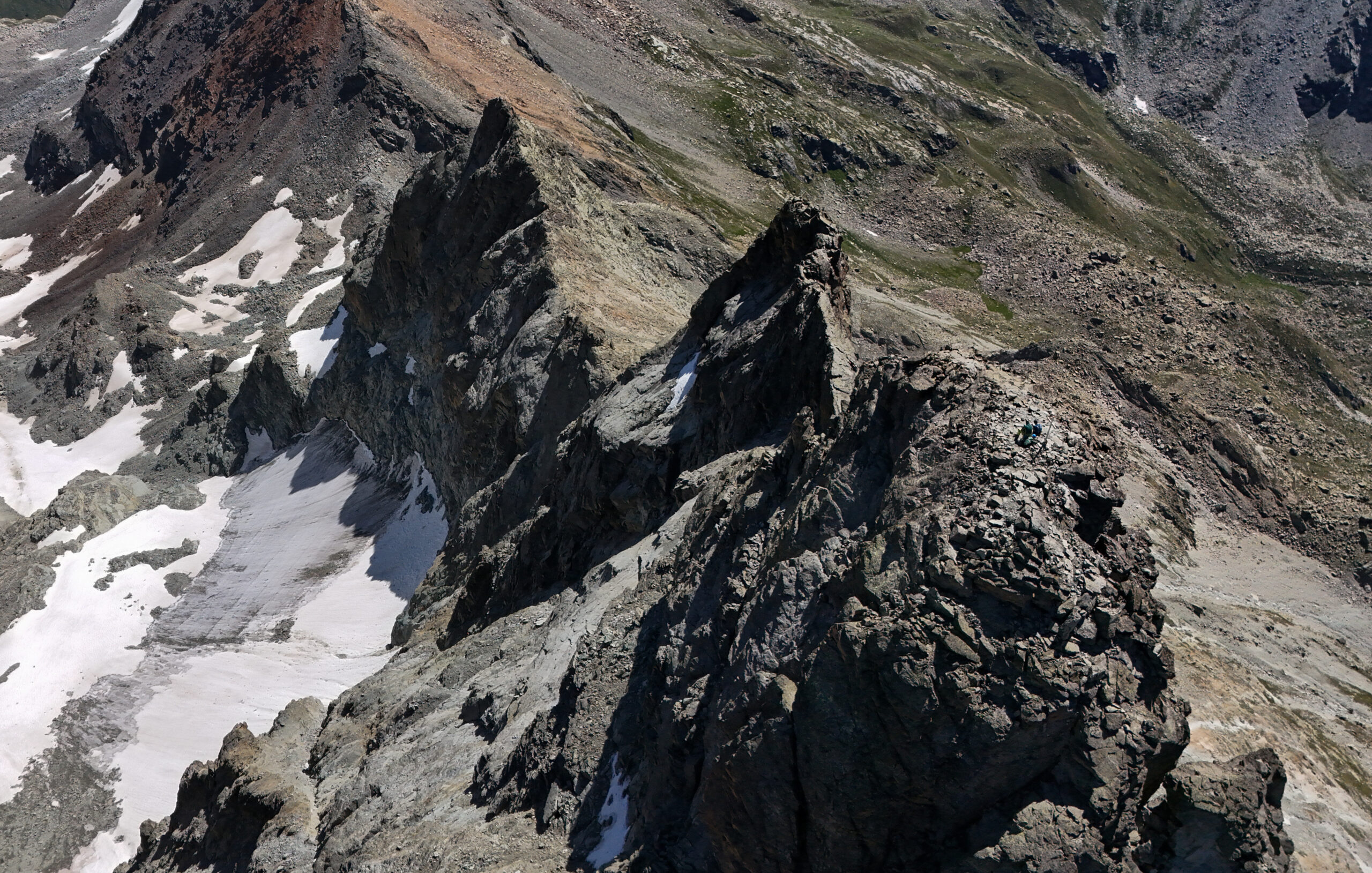 Blu: tiro che conduce in vetta (termina dalla sosta per calata) | dadoruggeri | Punta Tsan e la cresta Rey appena percorsa | dadoruggeri | Bivacco Rosazza | dadoruggeri | Uscita del canale | dadoruggeri | Mont Vélan | dadoruggeri | Panorama dalla vetta | dadoruggeri | Bivacco Rosazza | dadoruggeri | Ben visibili il canale e la cresta (sx) che porta in vetta la M. Cordine | dadoruggeri | | dadoruggeri | Attacco della via | dadoruggeri | L6