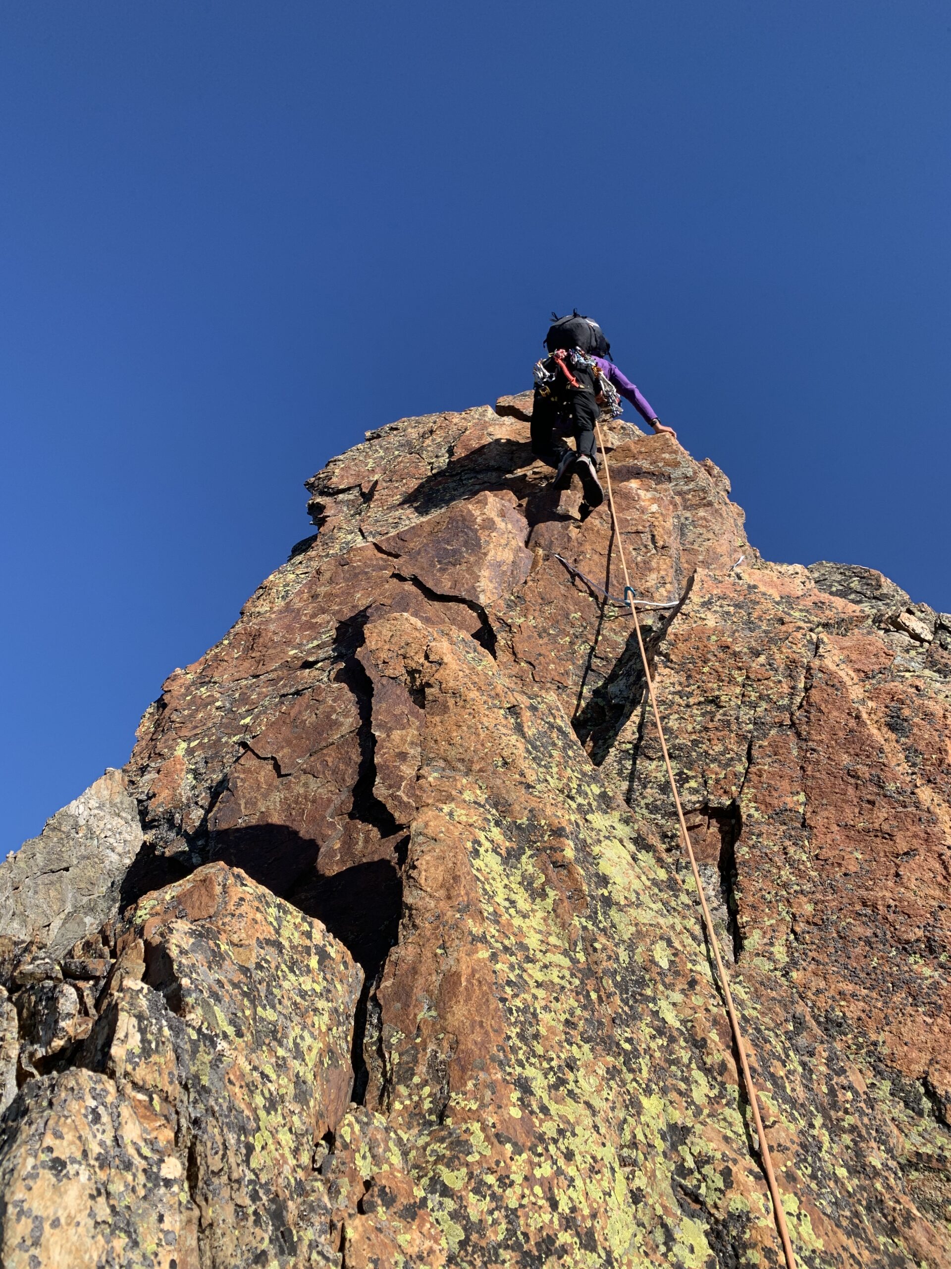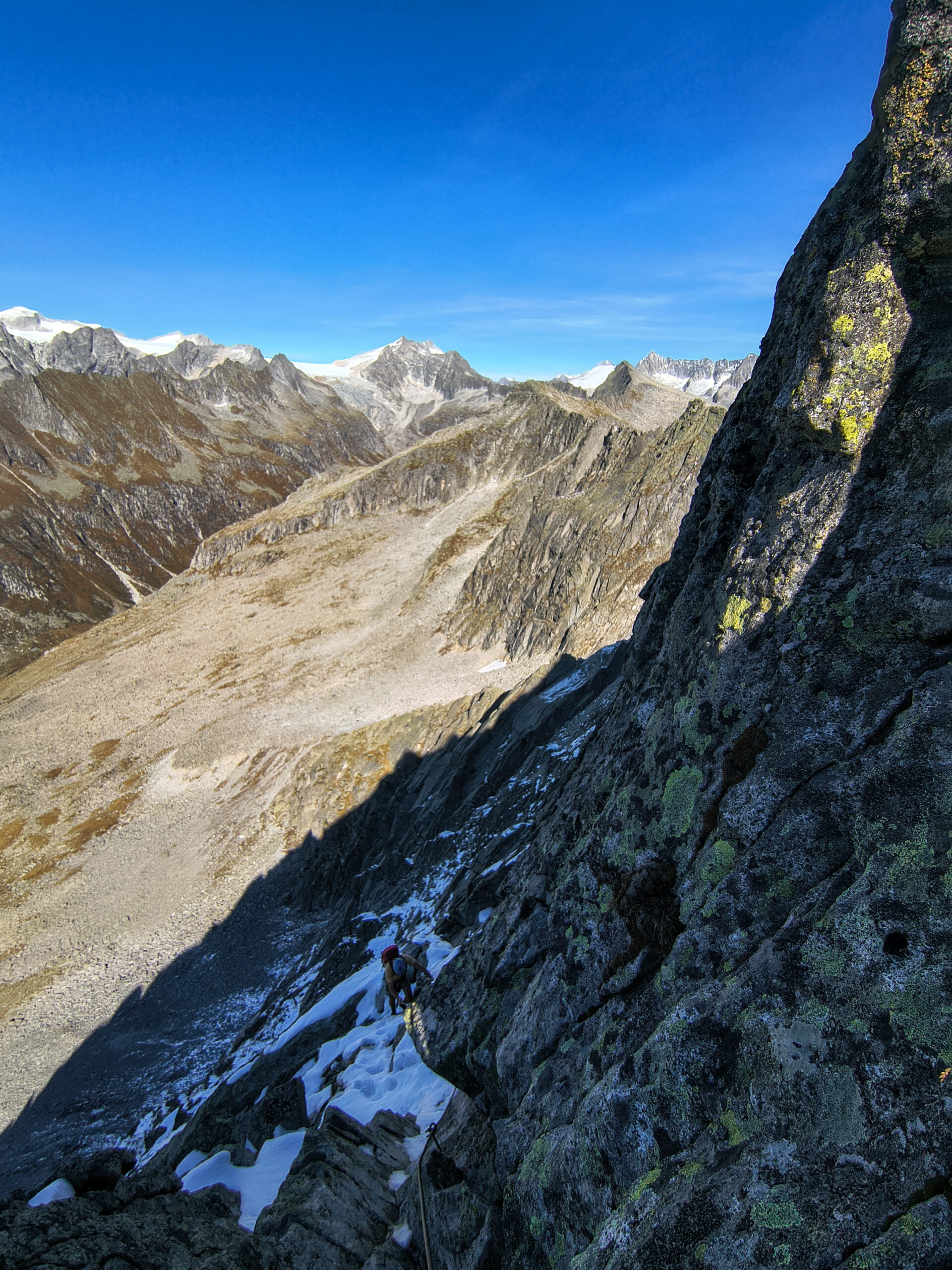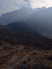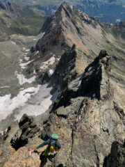 Blu: tiro che conduce in vetta (termina dalla sosta per calata) | dadoruggeri | Punta Tsan e la cresta Rey appena percorsa | dadoruggeri | Ultimo tratto di discesa dall'anticima, il più pericoloso in quanto tutto in disarrampicata. | dadoruggeri | Ultimi metri di disarrampicata