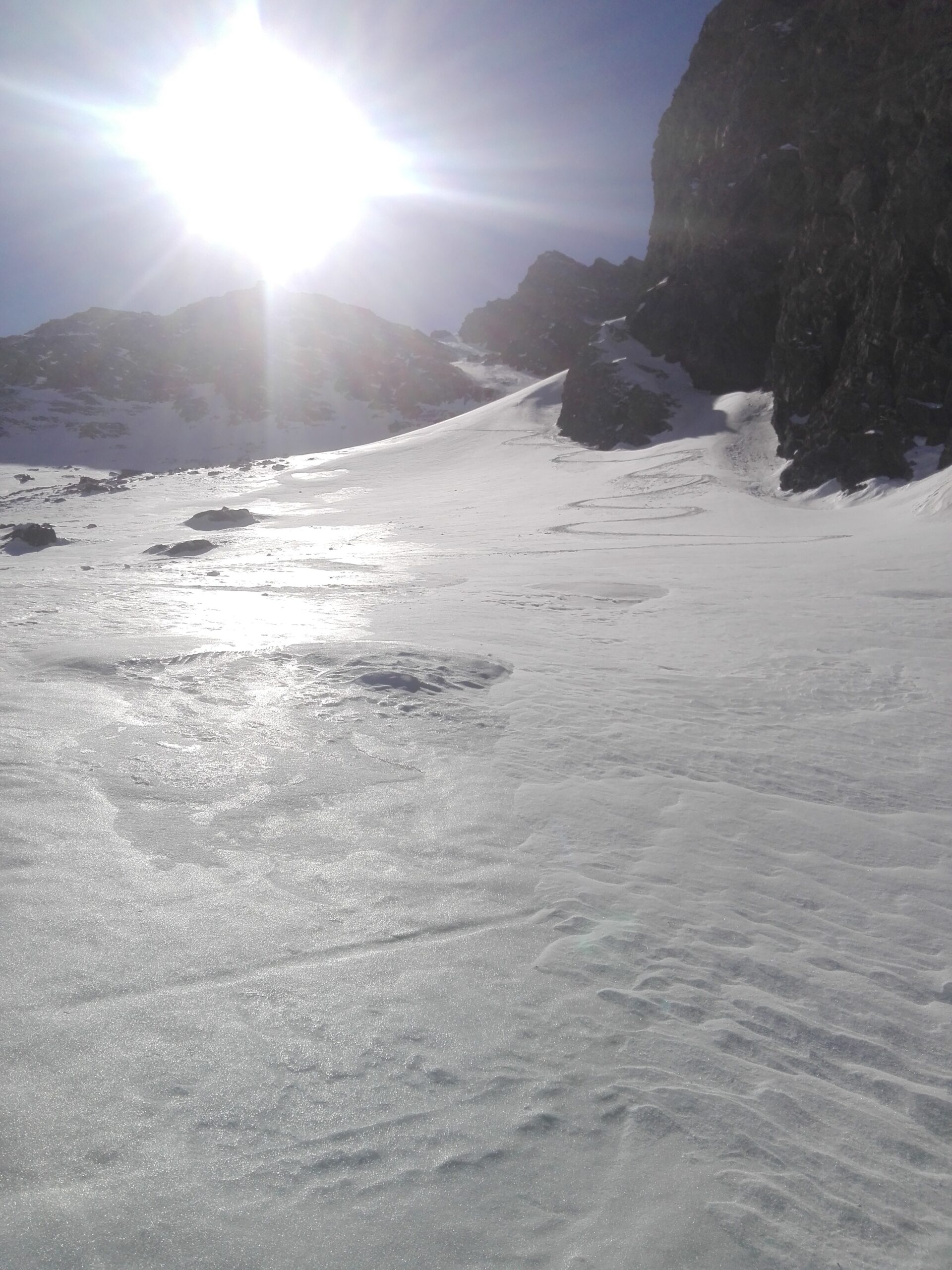 | damateis | il percorso di discesa fotografato di fronte (foto del 13/3/2021) | damateis | conca del lago Crotas, con l'ingresso della discesa sulla sx | damateis | qualche tratto di bella neve