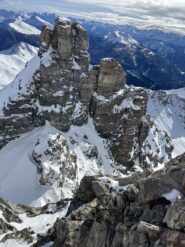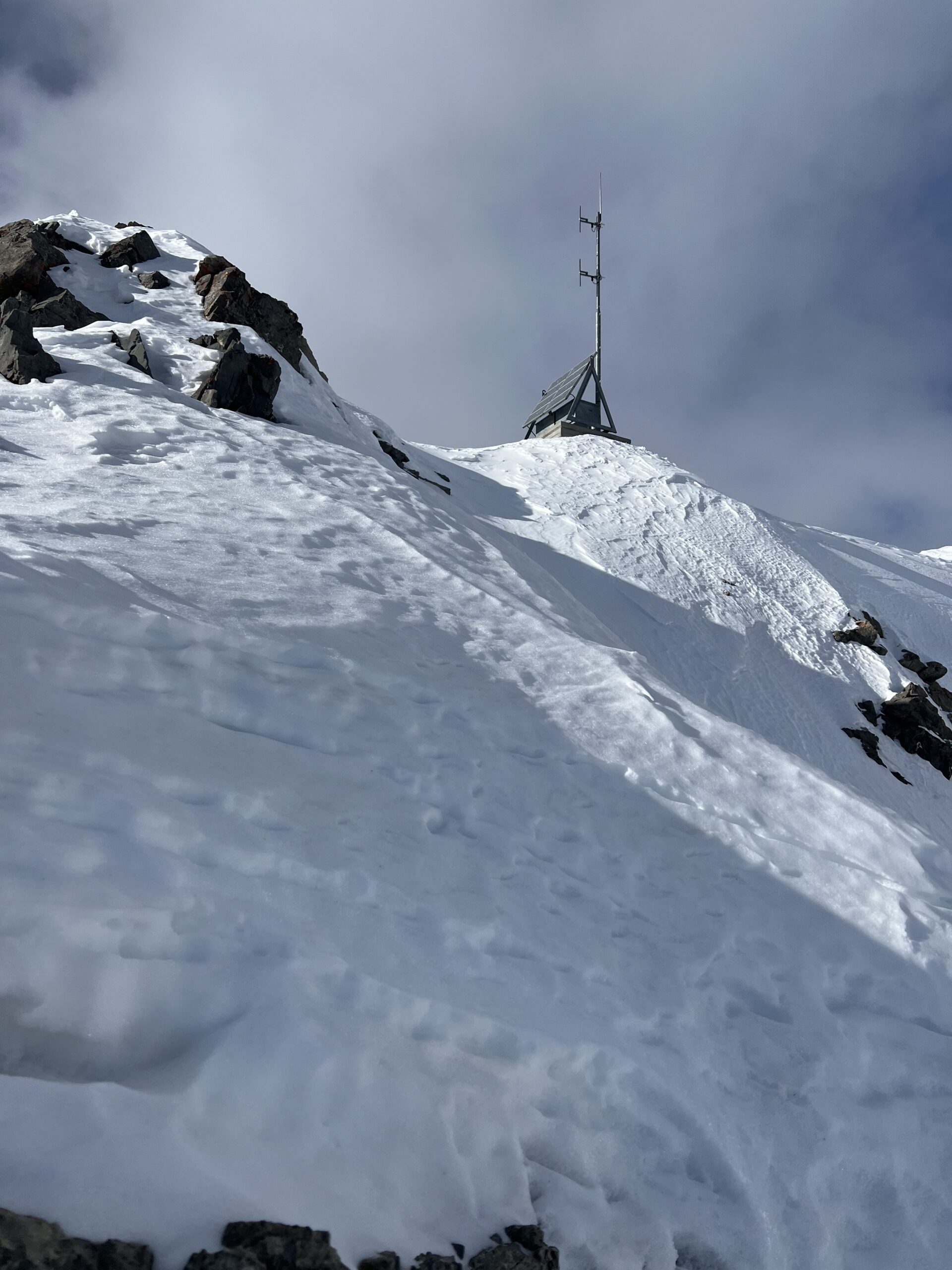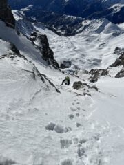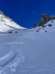 Tracciato l’intera gita dalla pista di fondo. Solo noi sul percorso. Poco sopra il colletto abbiamo lasciato gli sci e proseguito picca e ramponi, ma conviene lasciarli…
