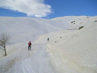 Splendida giornata di sole, neve in abbondanza nel canalone e, sfruttando le lingue, si scende con gli sci ancora molto in basso verso il pian…
