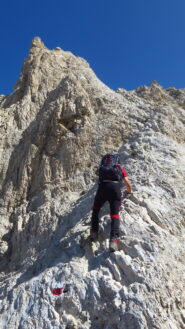 Via ottimamente segnalata da tacche bianche e rosse oltre agli storici segni verdi. Arrampicata divertente e appagante. Discesa per la cresta ovest, anche questa ben segnalata…